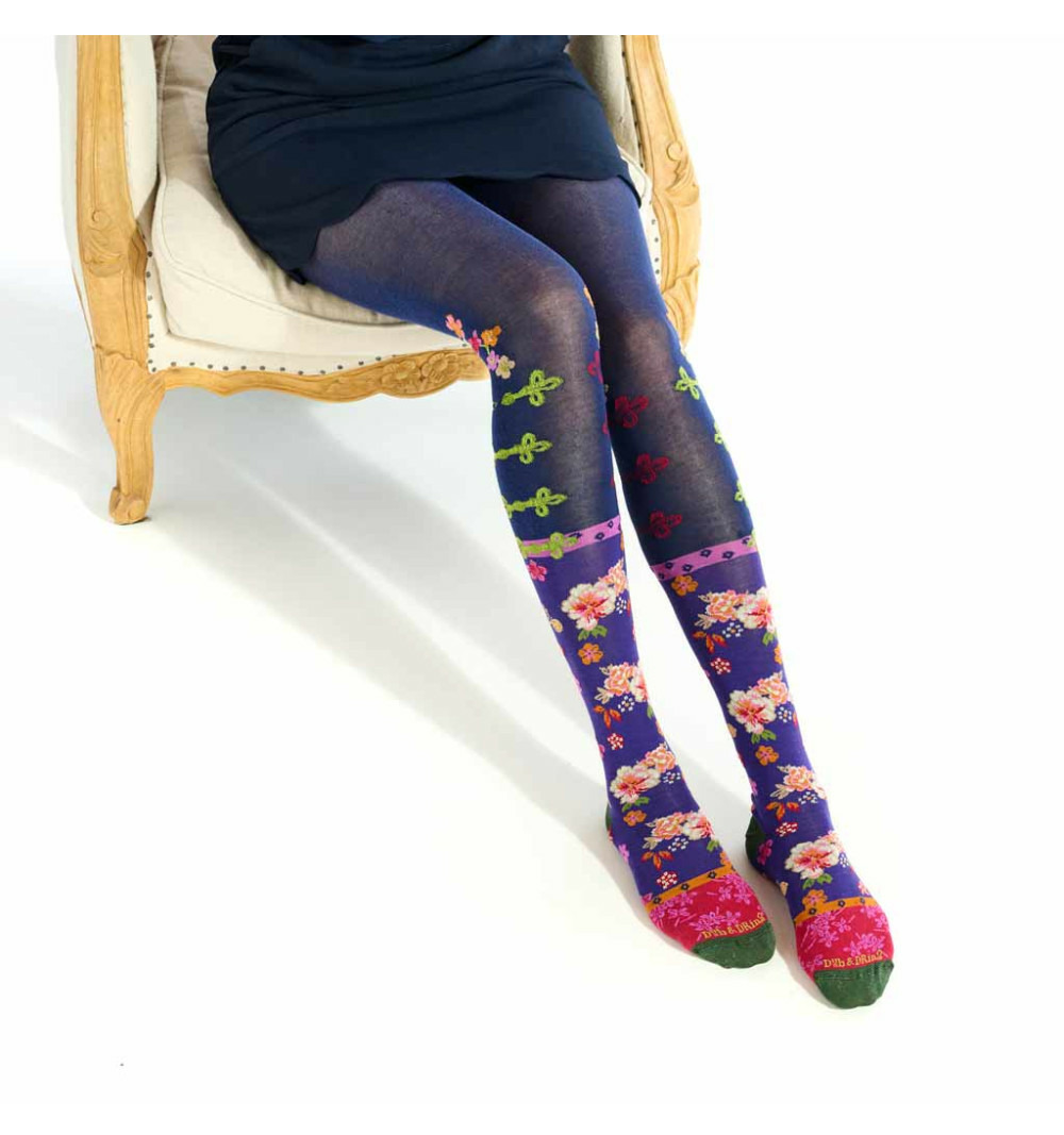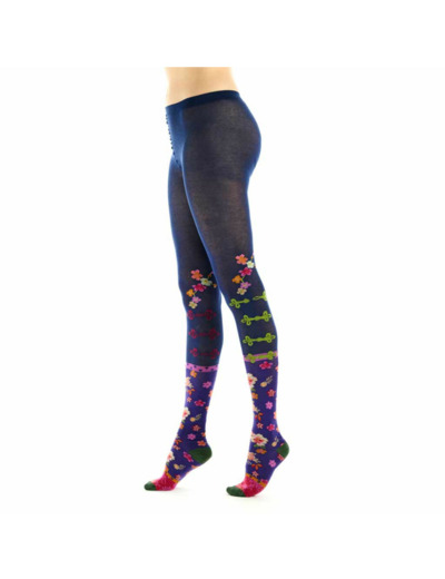 Laissez-vous séduire par le charme des collants Shochikubai de DUB & Drino, un véritable mélange de fantaisie et de confort. Fabriqués en Italie, ces collants sont décorés de motifs floraux éclatants en nuances de rose, orange et blanc sur un fond violet et bleu profond. Les touches de vert vif et de rouge apportent une touche de gaieté et d'élégance. Les motifs artistiques se déploient le long des jambes, créant un effet visuel unique et enchanteur.