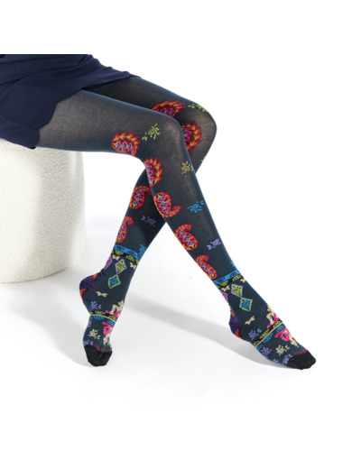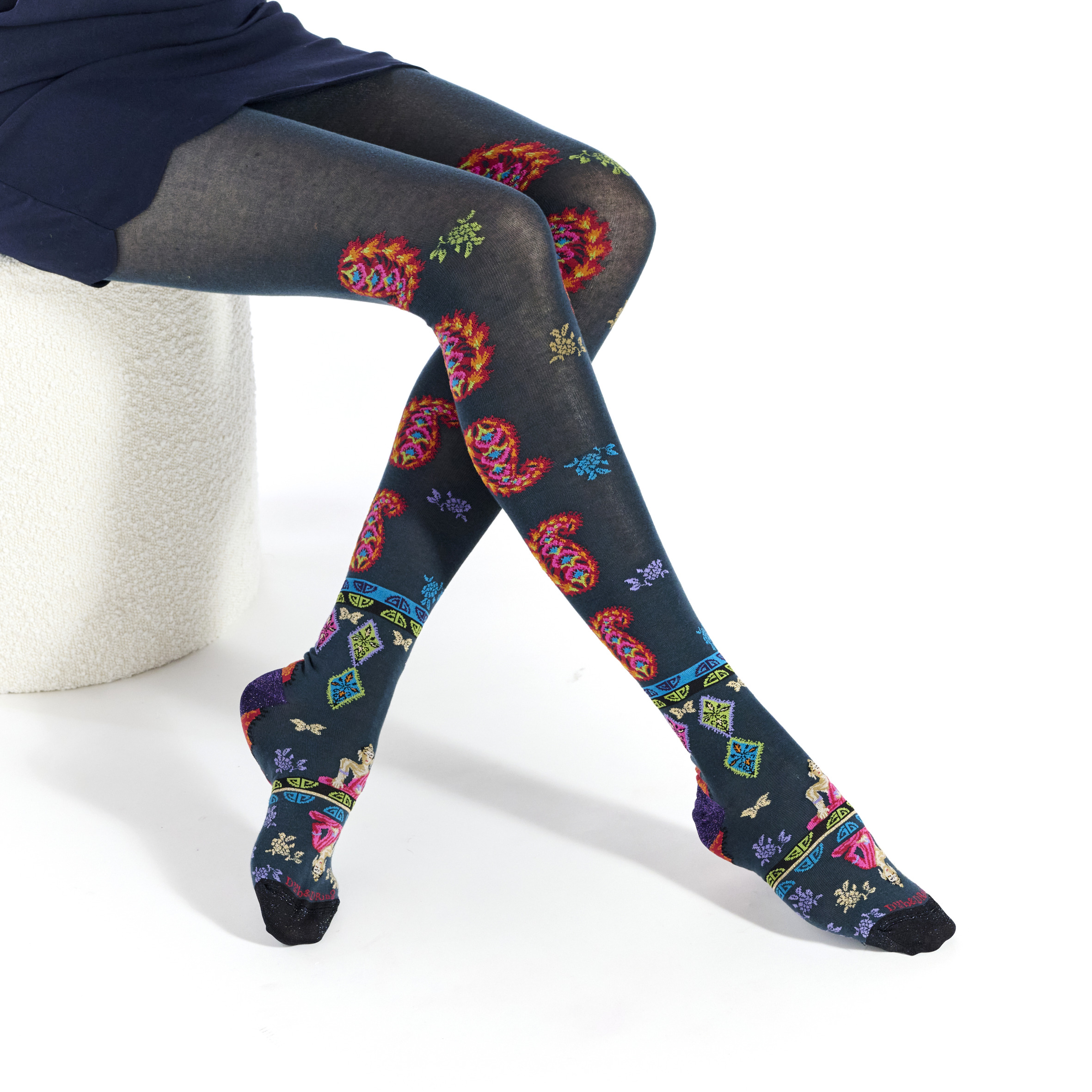 Collant Coton fantaisie, ils arborent des motifs inspirés de la culture indienne et hindoue avec une représentation de shiva sur le pied et des ornements colorés qui remontent jusqu'aux cuisses.