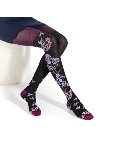 Collant coton sur fond noir avec des motifs de plantes fleuries, avec des fleurs violettes et roses qui remontent le long de la jambe.