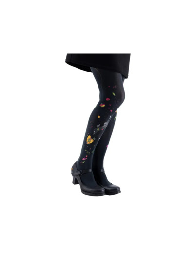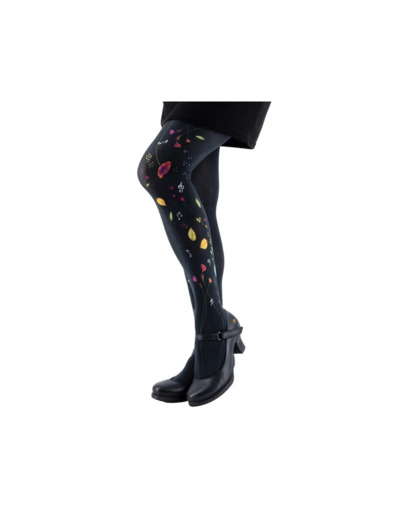 Collants fantaisie allient fleurs éclatantes et notes musicales sur fond noir. Confort, qualité et style au rendez-vous pour femmes et filles.