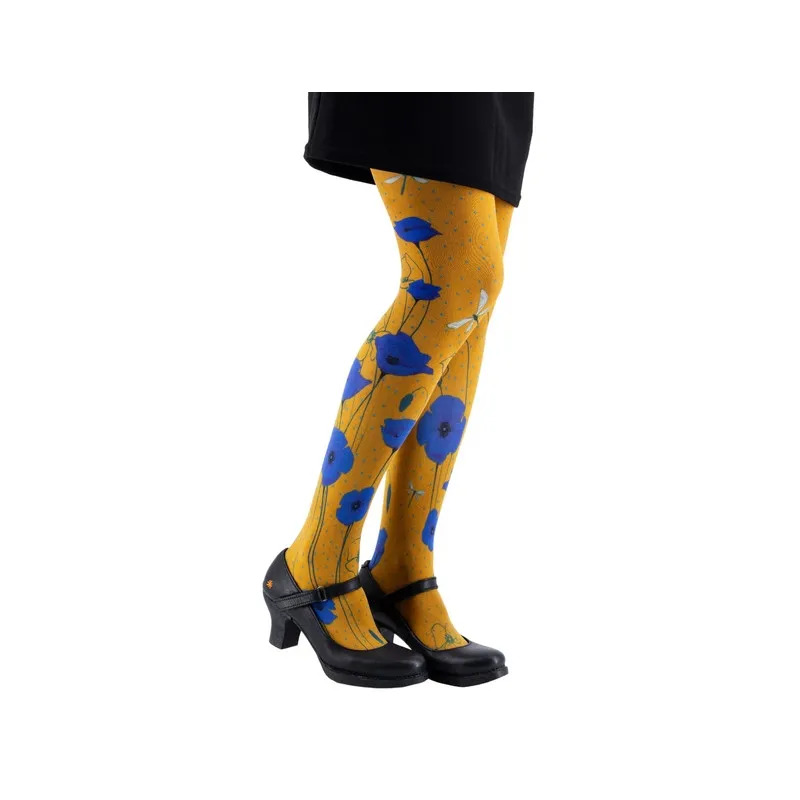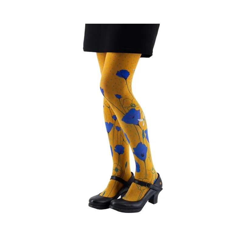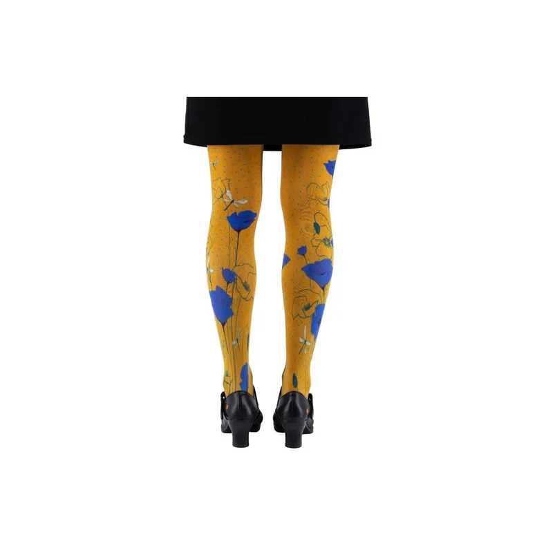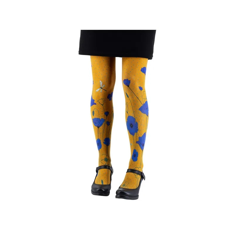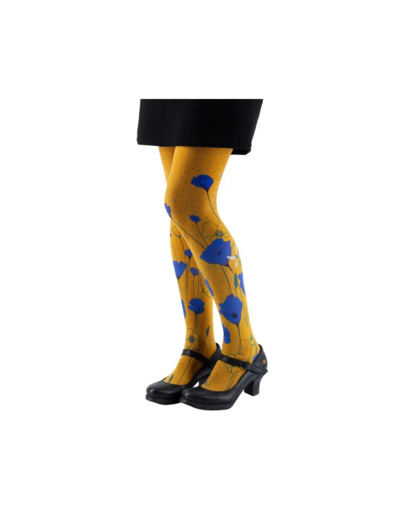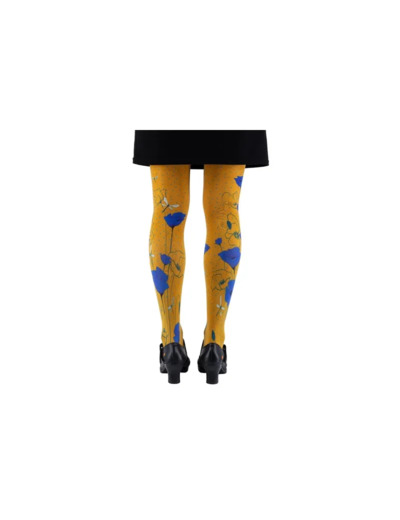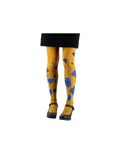 Collant de la Marque LILI GAMBETTES sur fond jaune éclatant met en valeur des coquelicots bleus délicatement dessinés, apportant une touche artistique et originale à vos tenues,