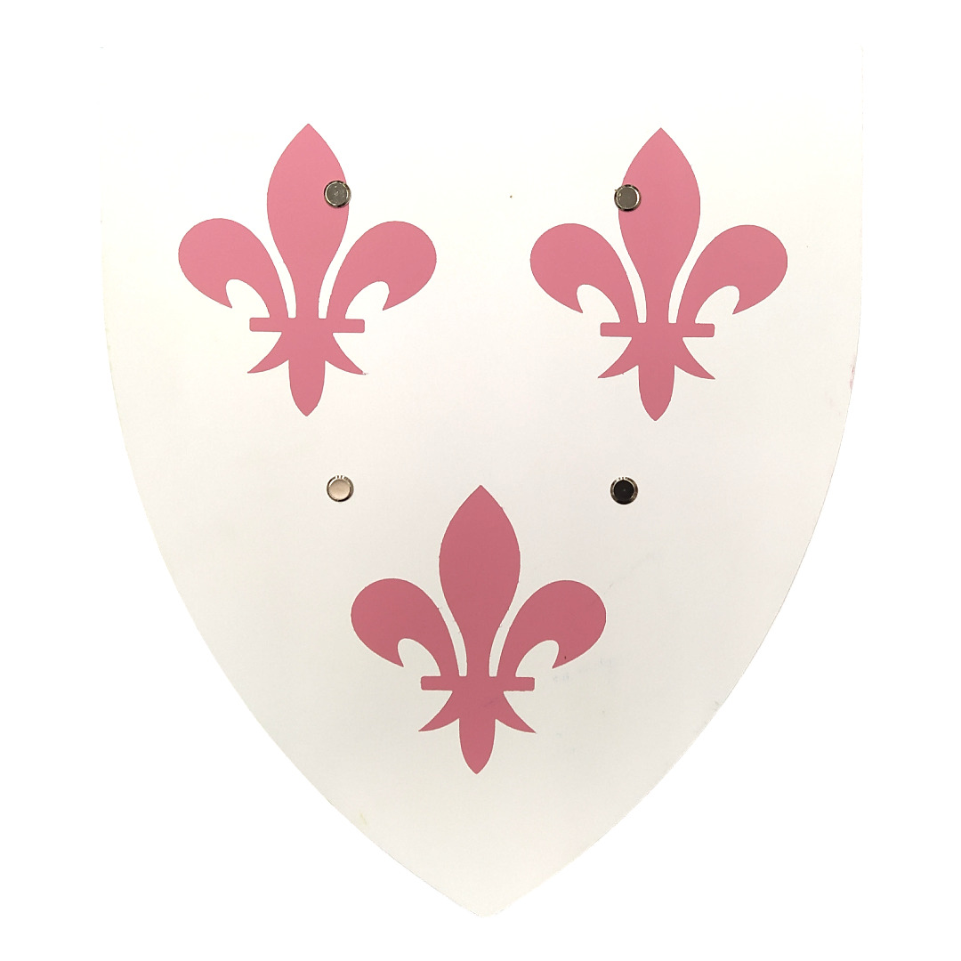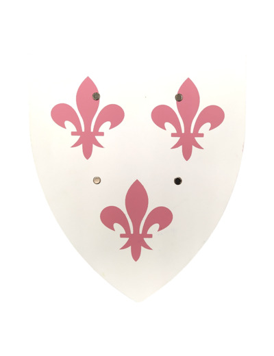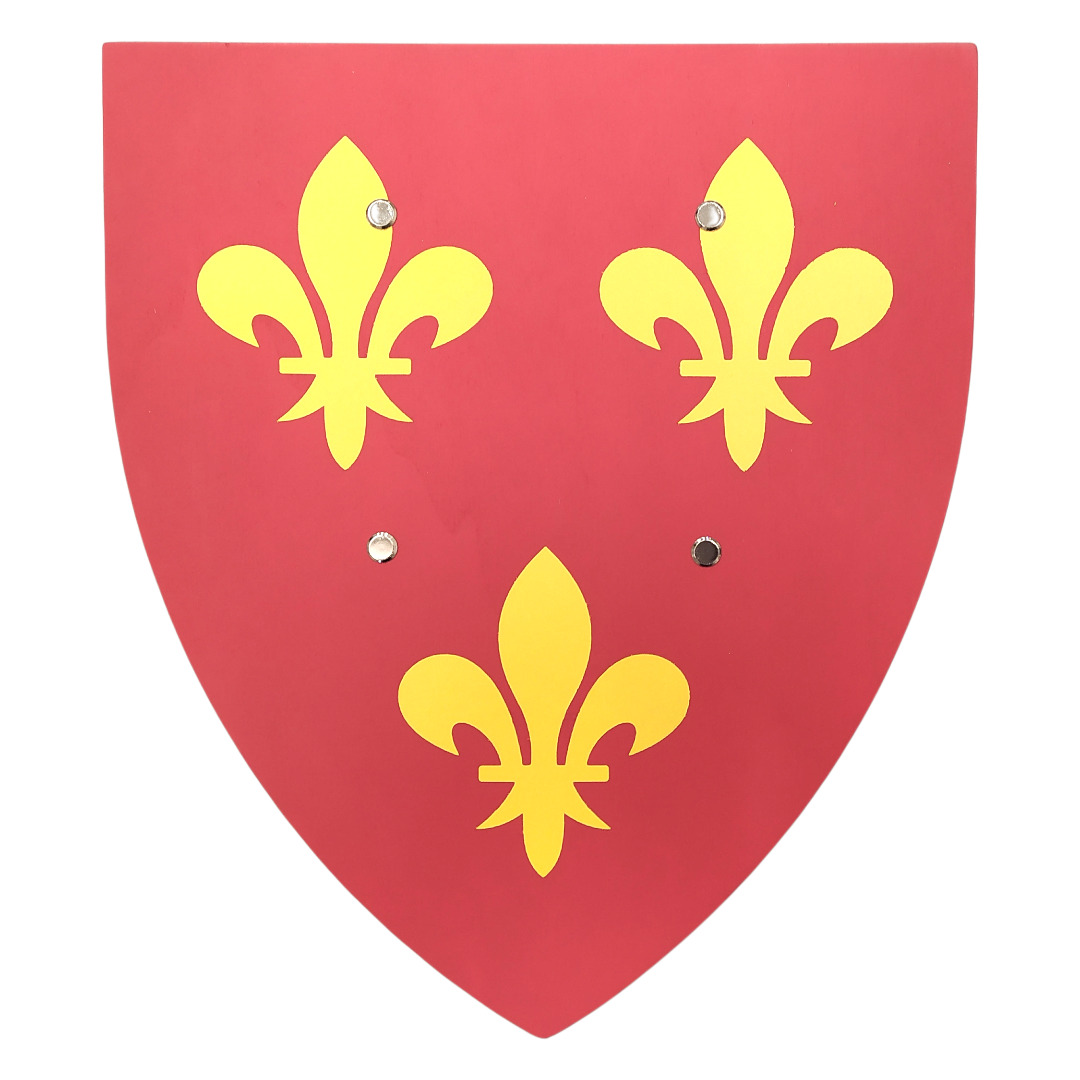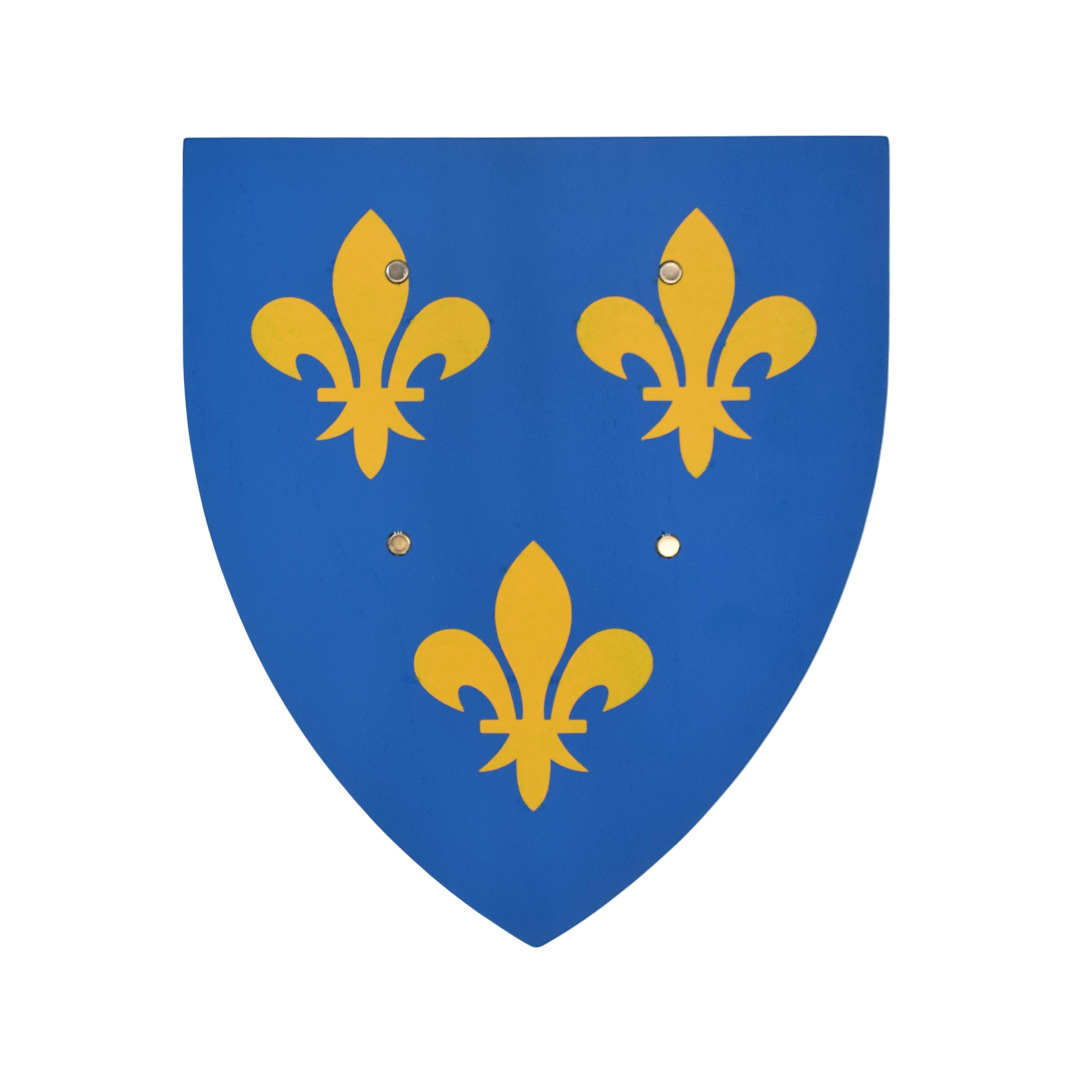 L’écu est façonné en contreplaqué de peuplier, un bois français léger et solide. Chaque exemplaire est peint à la main avec cinq couches de laque à l’eau de haute qualité, garantissant des couleurs éclatantes et résistantes. Les motifs respectent les règles héraldiques traditionnelles et chaque bouclier est conforme à la norme jouet.