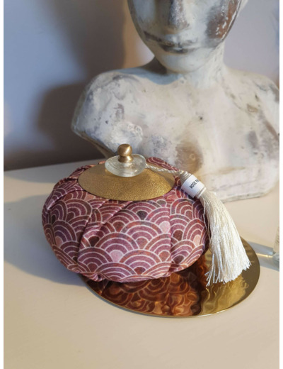 Dans un tissu surmonté d'un ornement en métal travaillé avec une joli perle , cette aumônière parfume votre pièce pendant 5 à 6 mois grace aux petites pierres de lave imprégnées de parfum qui se cachent à l'intérieur .