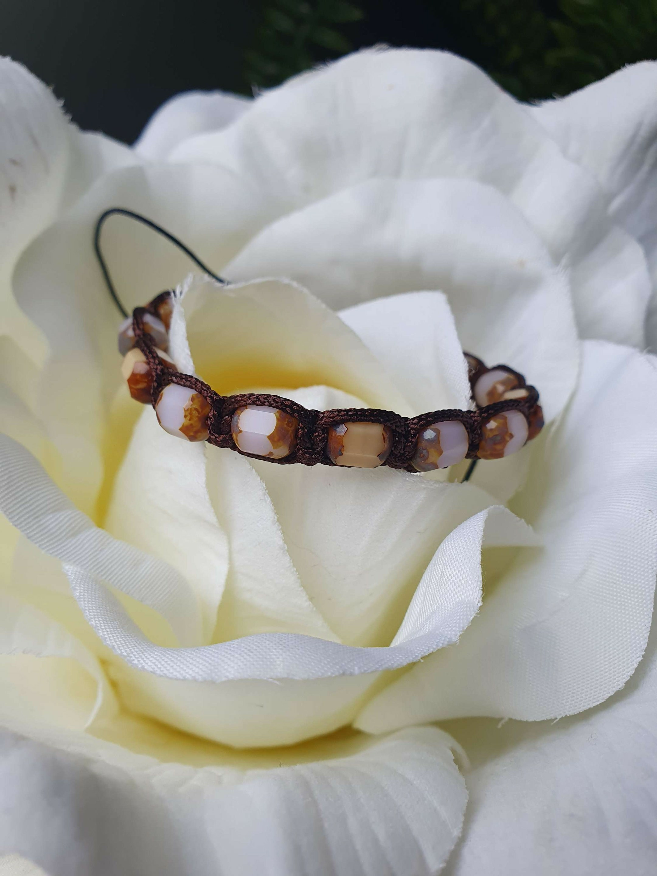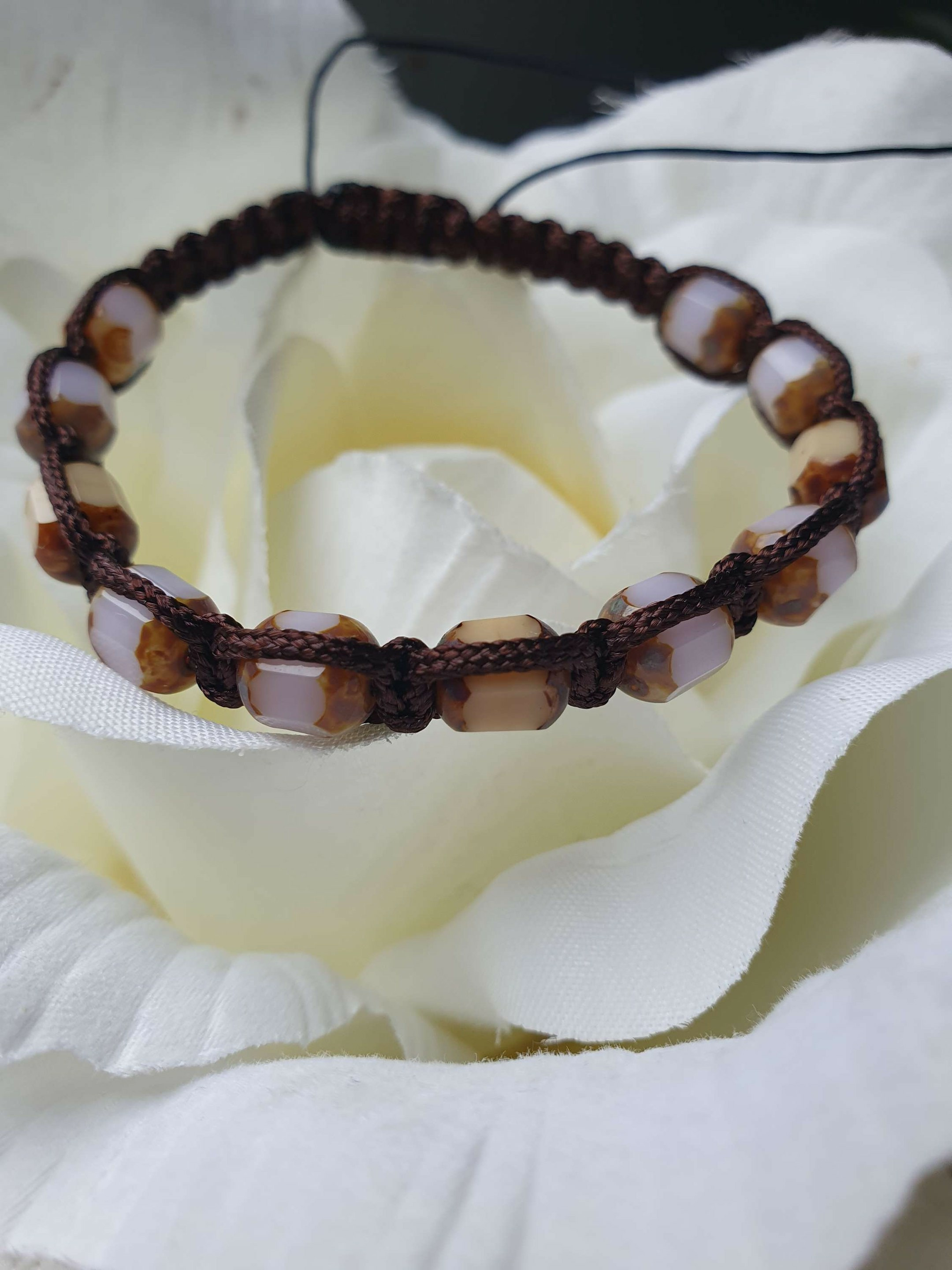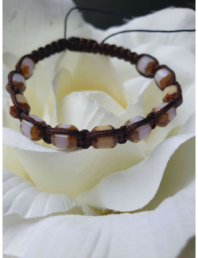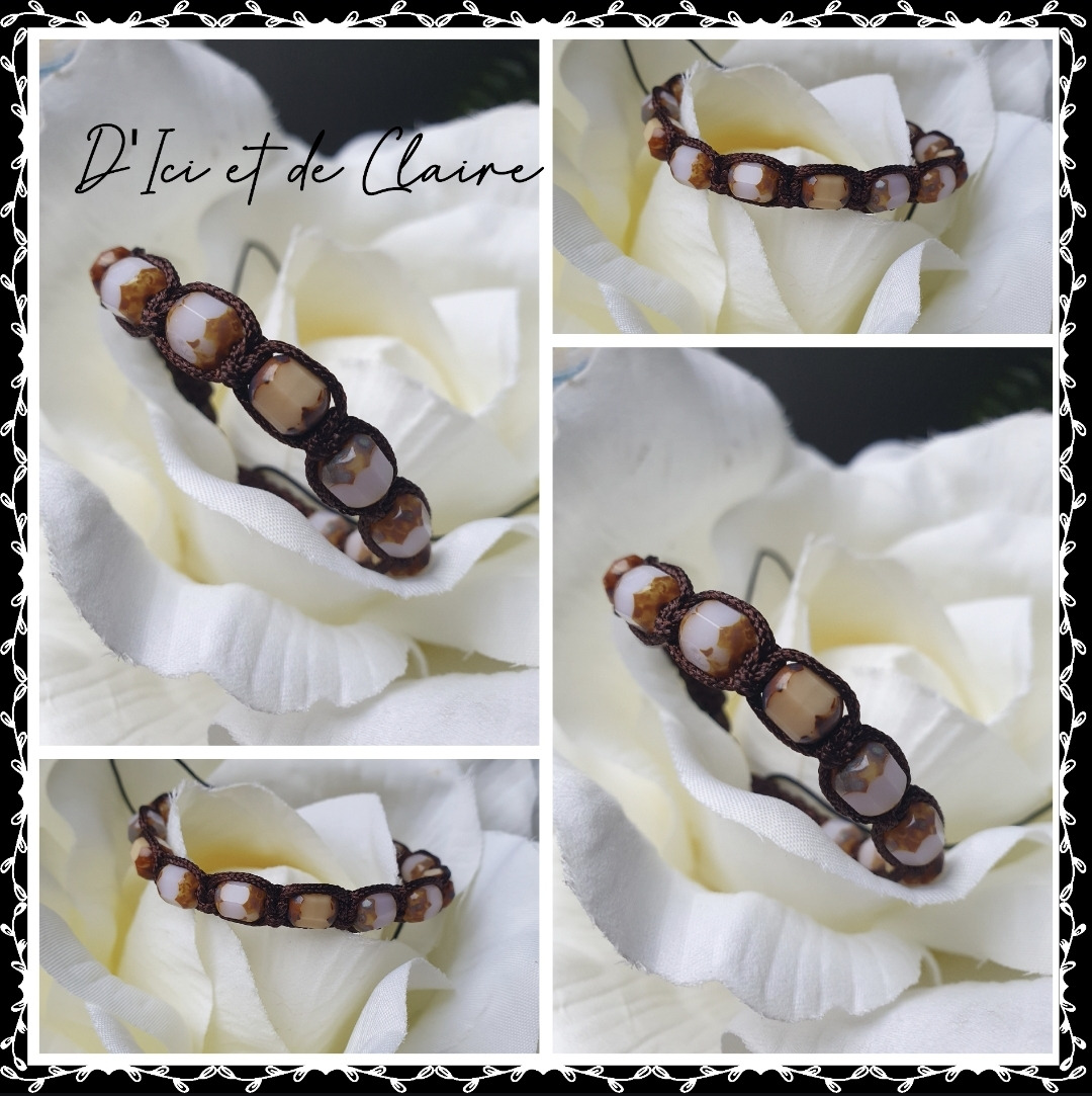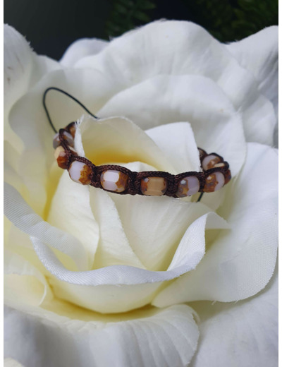 Bracelet Shamballa tressé avec fil nylon marron.