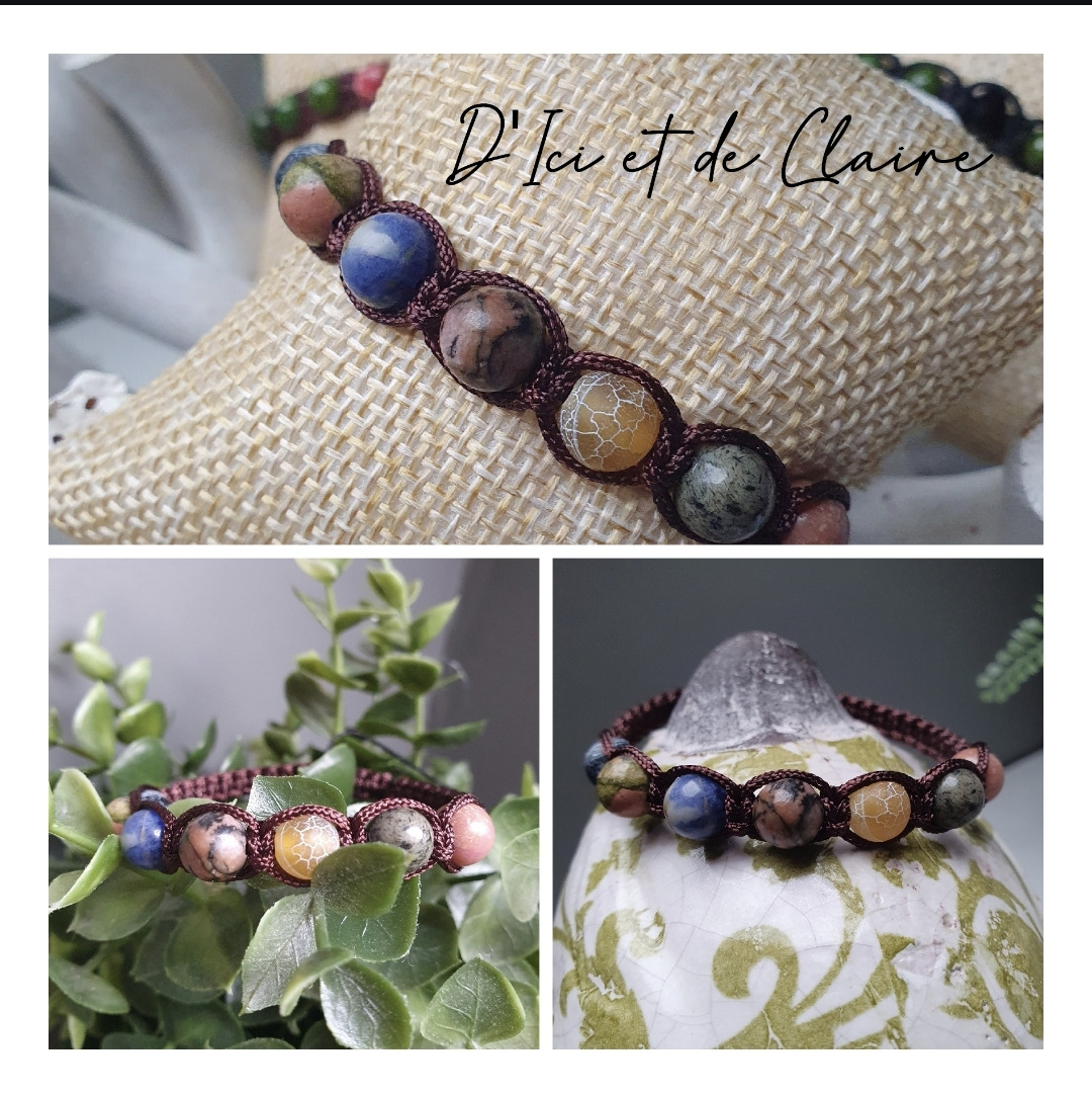 Les perles sont en pierres naturelles, lapis-lazuli, jaspe...et 2 perles de verre