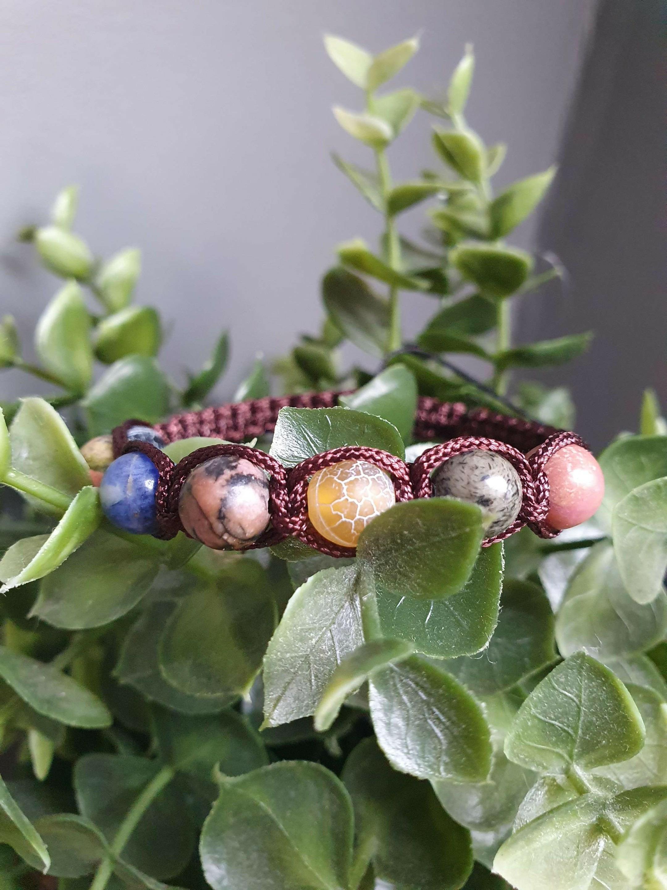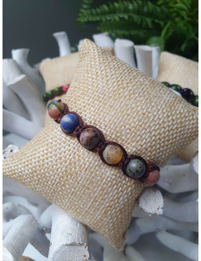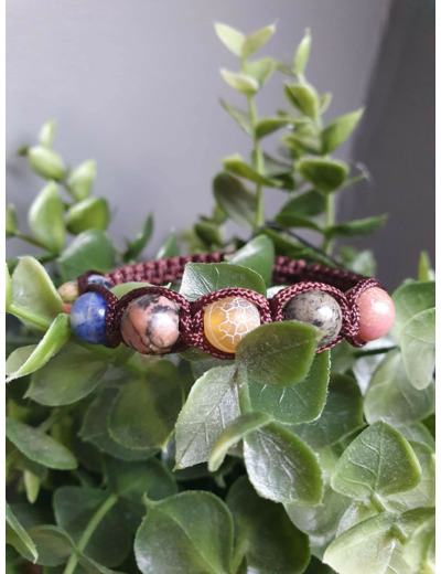 Bracelet Shamballa tressé avec fil nylon marron.
