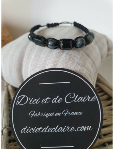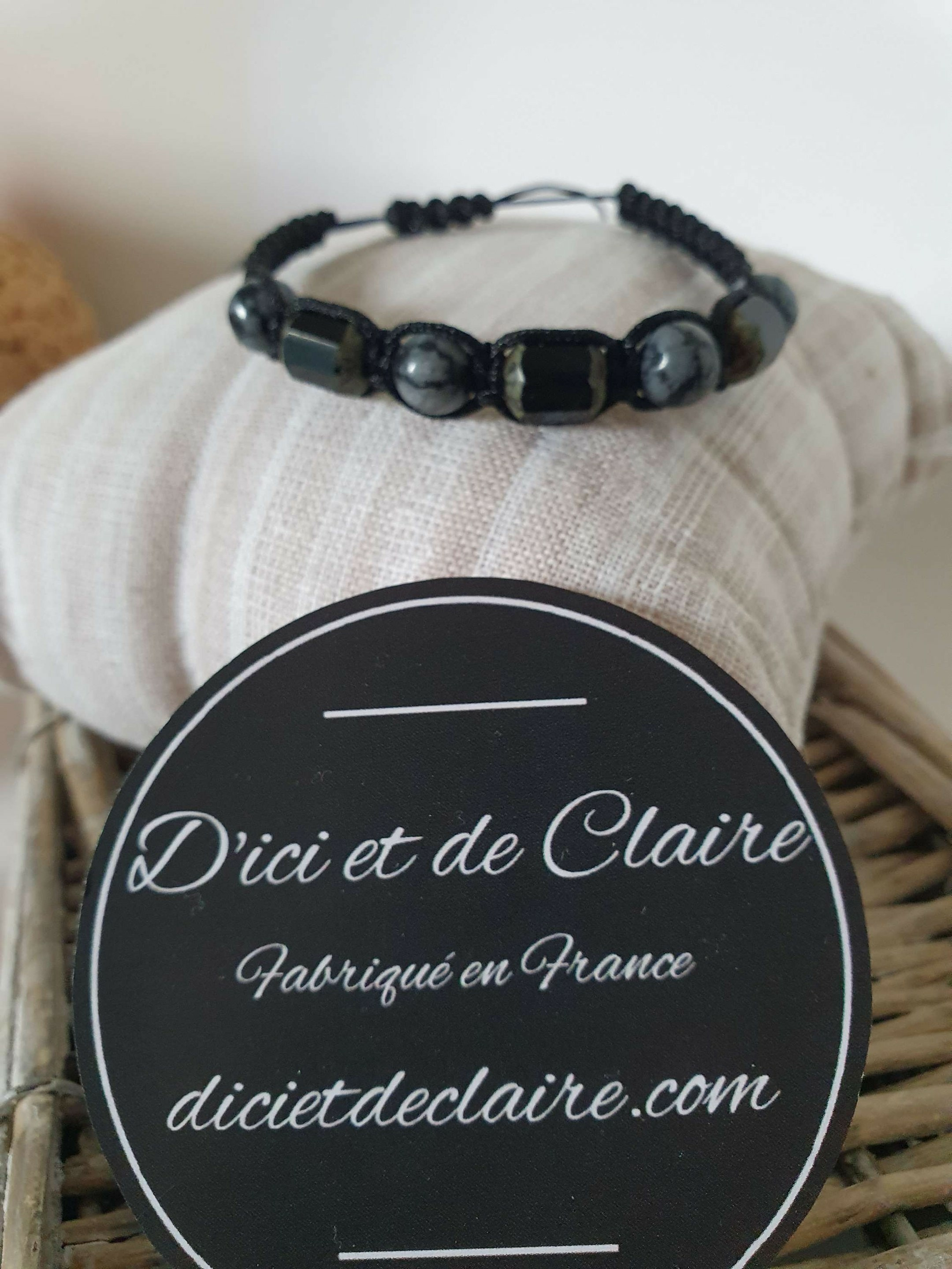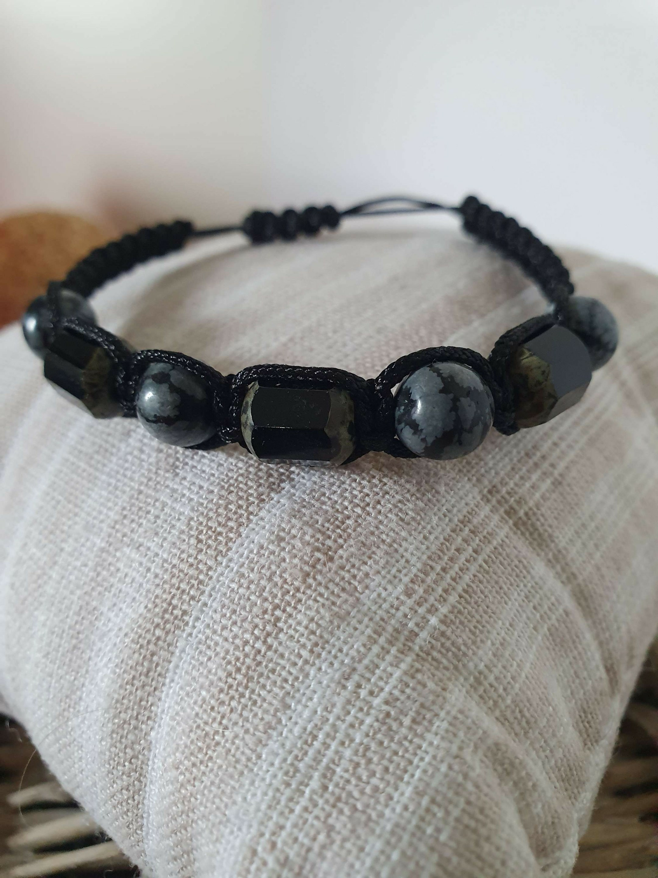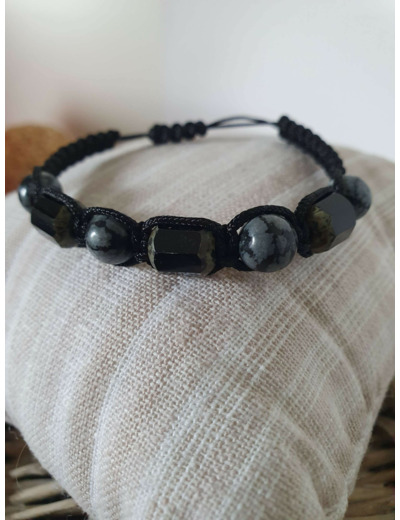 Bracelet Shamballa tressé avec fil nylon noir.
