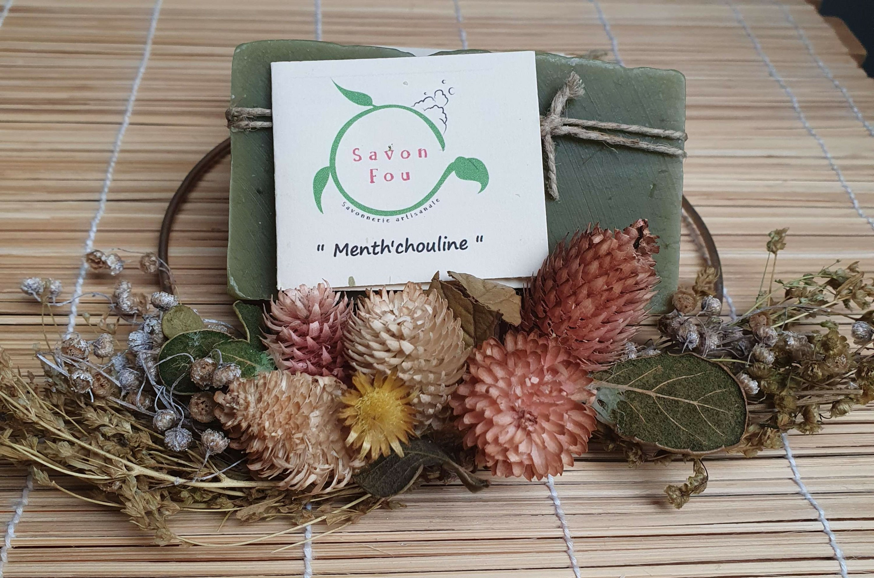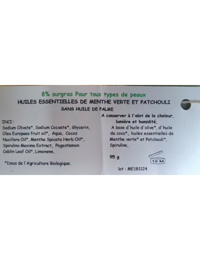Savon Menth'Chouline aux huiles essentielles de ,menthe bio pour ses qualités purifiantes et rafraichissantes et de Patchouli régénératrices pour la peau.
