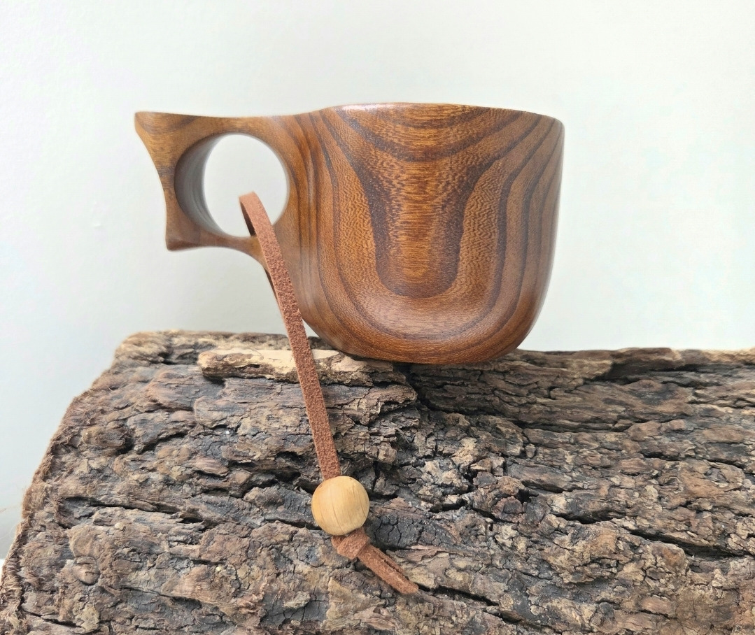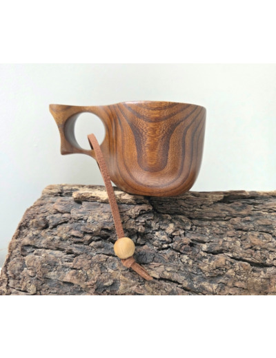 La Tasse Kuksa est une tasse sculptée à la main dans un bloc de bois , ici de l'Orme avec une dragonne ornée d'une perle en bois de Chêne.