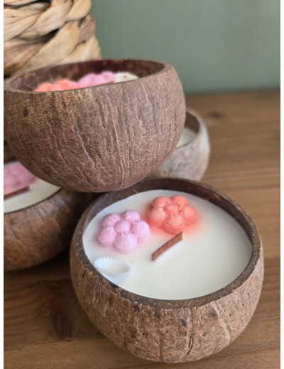 Bougie COCO coulée directement dans une véritable coque de Noix de Coco polie et soigneusement sélectionnée .