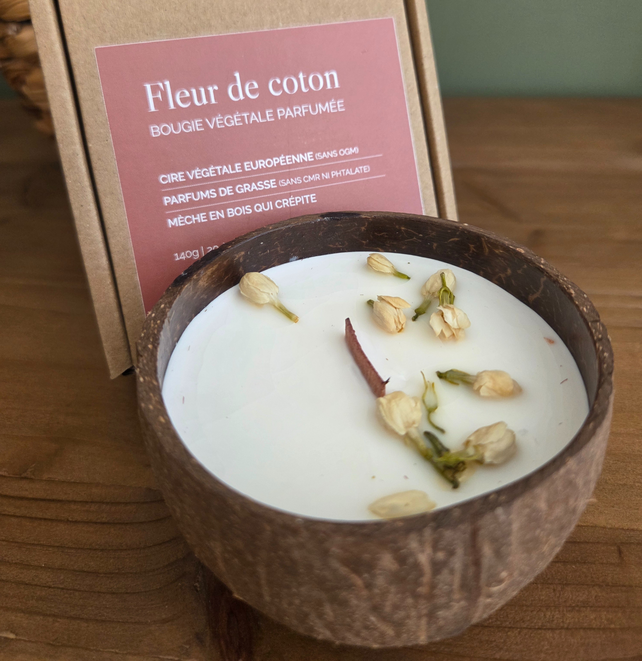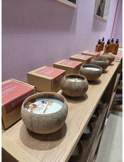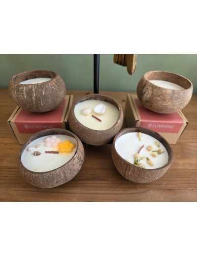 Bougie COCO coulée directement dans une véritable coque de Noix de Coco polie et soigneusement sélectionnée .