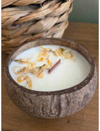 Bougie COCO coulée directement dans une véritable coque de Noix de Coco polie et soigneusement sélectionnée .