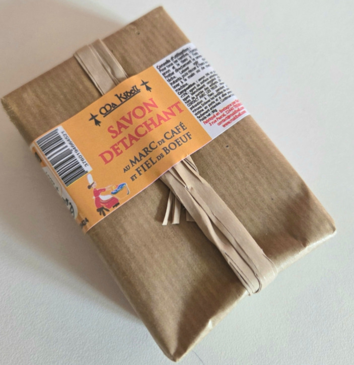 Savon enrichi au Marc de Café et au Fiel de Boeuf , deux ingrédients naturels et reconnus pour leur efficacité détachante .