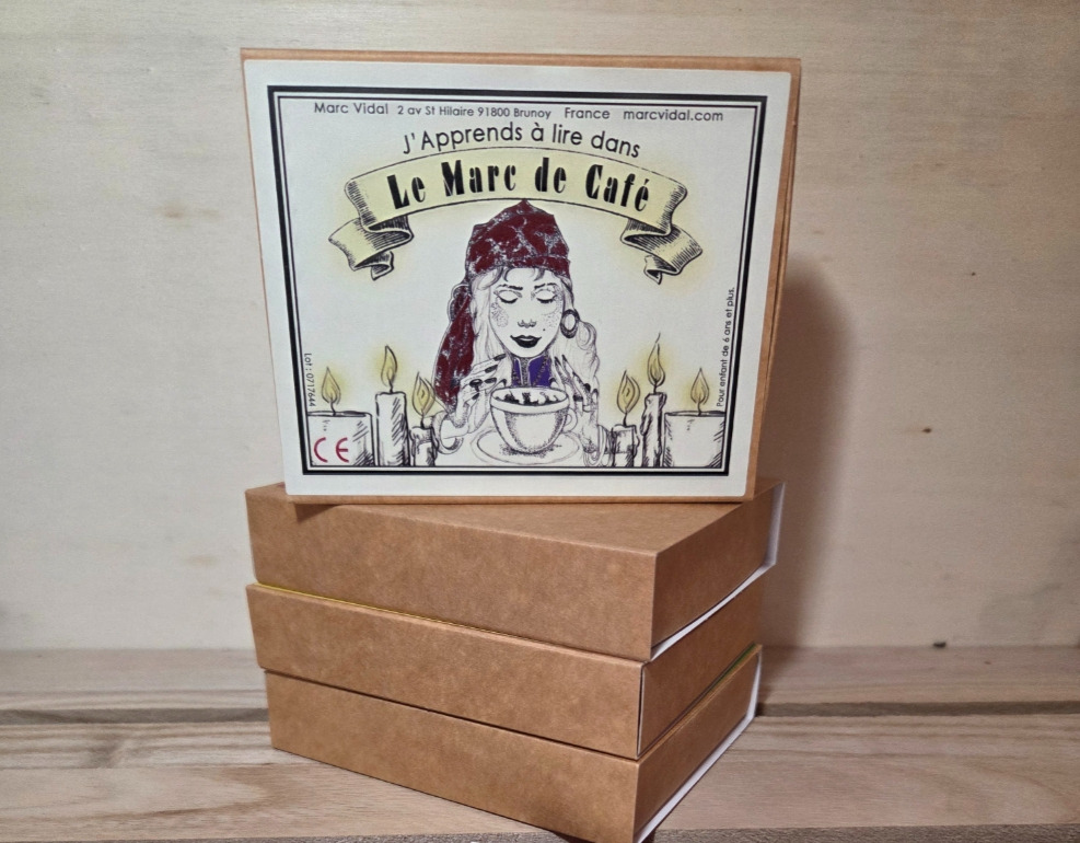Le MARC DE CAFE , une initiation pour apprendre à lire dans le marc de café présentée dans une boite en carton 10X8 cm .