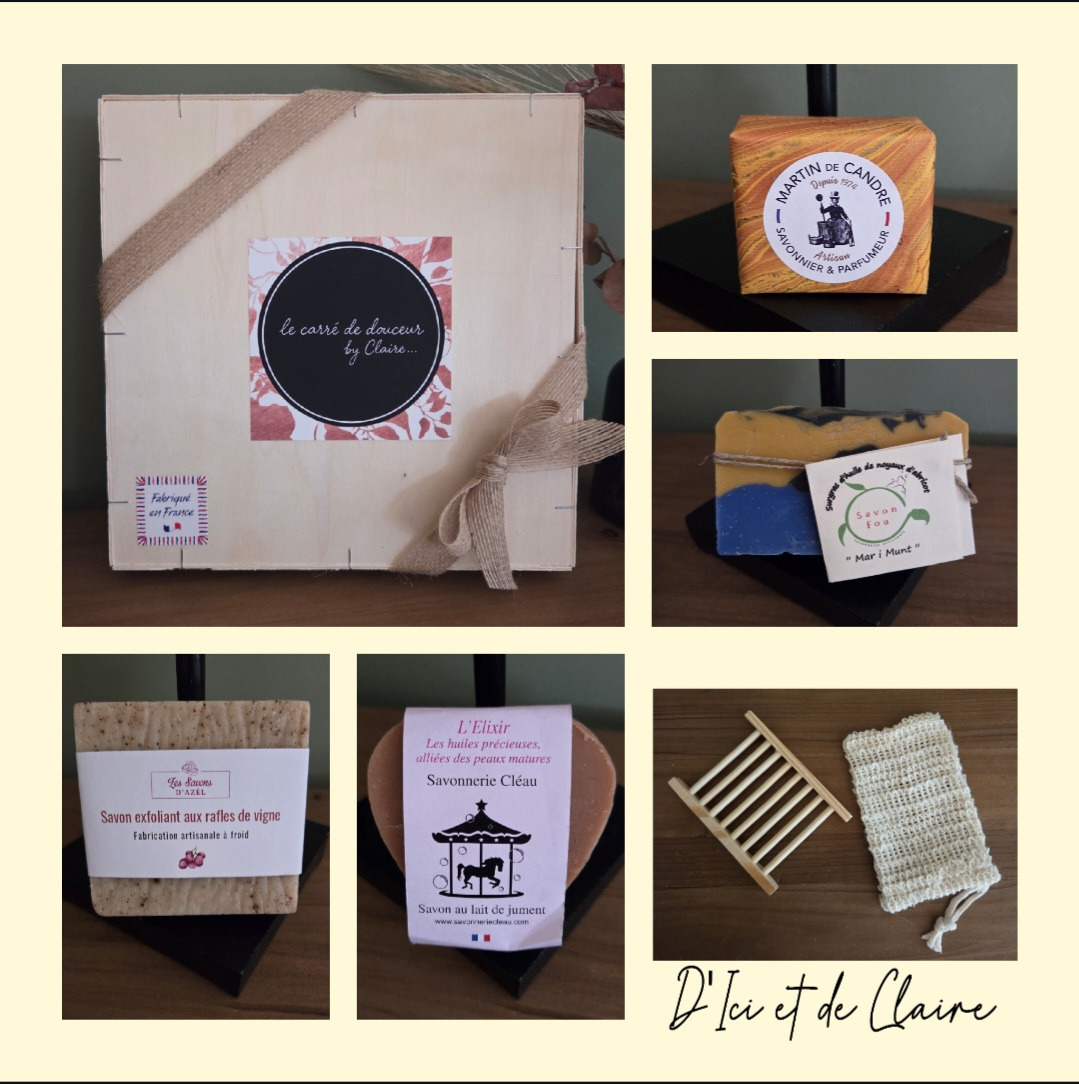 L'ensemble est présenté dans un élégant emballage en bois réutilisable . Conçu pour durer , ce coffret peut servir ensuite à stocker et faire sécher les savons tout au long de leur utilisation, alliant ainsi esthétique, praticité et démarche responsable.