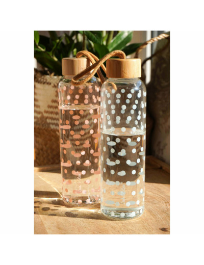 La bouteille en verre est dotée d'un design à pois roses et d'un couvercle en bambou 100% étanche.
