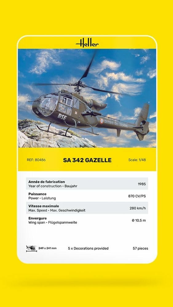 Prenez les commandes de l’hélicoptère léger le plus emblématique de l’armée française avec cette maquette Heller SA 342 Gazelle ! Avec ses 57 pièces, ce kit de niveau débutant (niveau 2) vous plonge dans l’univers de l’aéronautique militaire des années 1970 à aujourd’hui.