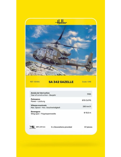 Utilisée par les forces françaises, britanniques et d'autres armées à travers le monde, la Gazelle est célèbre pour sa maniabilité, sa silhouette reconnaissable entre mille et son cockpit bulle. Cette maquette permet de recréer un appareil légendaire de reconnaissance et d’appui léger.