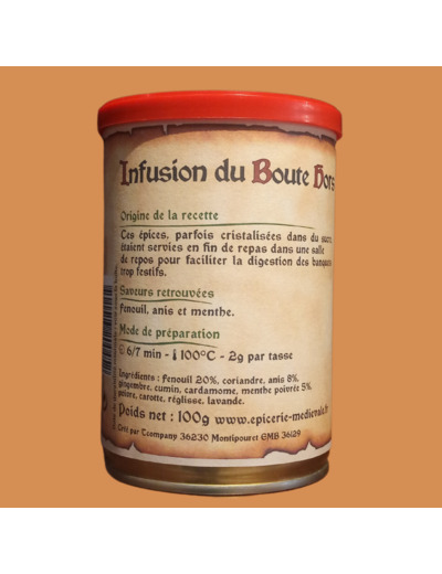 Origine de la recette: Ces épices, parfois cristallisées dans du sucre, étaient servies en fin de repas dans une salle de repos pour faciliter la digestion des banquets trop festifs. Saveurs: Fenouil, anis et menthe. Ingrédients: fenouil 20%, coriandre, anis 8%, gingembre, cumin, cardamome, menthe poivrée 5%, poivre, carotte, réglisse, lavande.