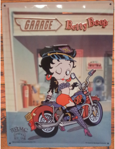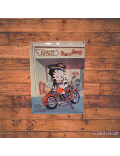 Plaque Garage Betty Boop sur sa moto vintage. Pour les fans de déco US et/ou de Betty Boop. A offrir ou à s'offrir pour compléter une déco vintage.