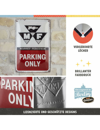 Design : style vintage avec mention "Parking Only" et logo Massey Ferguson