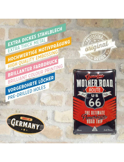 Très belle plaque métal Route 66. Cette plaque est fabriquée par la marque allemande Nostalgic Art. Très jolie plaque à installer dans un garage, un bureau. Cette plaque est bombée et en relief. Le fait de bomber la plaque permet de la rigidifier et de l'alléger. Le rendu 3d apporte une grande profondeur à cette plaque. Pour le Fan de Moto et de la Déco US
