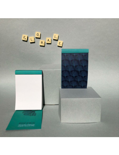 Bloc-notes fermé fond coloris bleu marine motif ginko turquoise