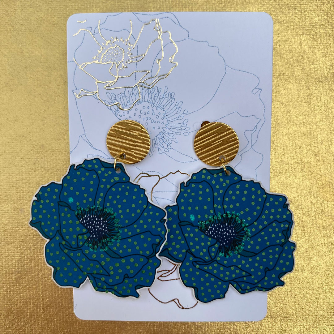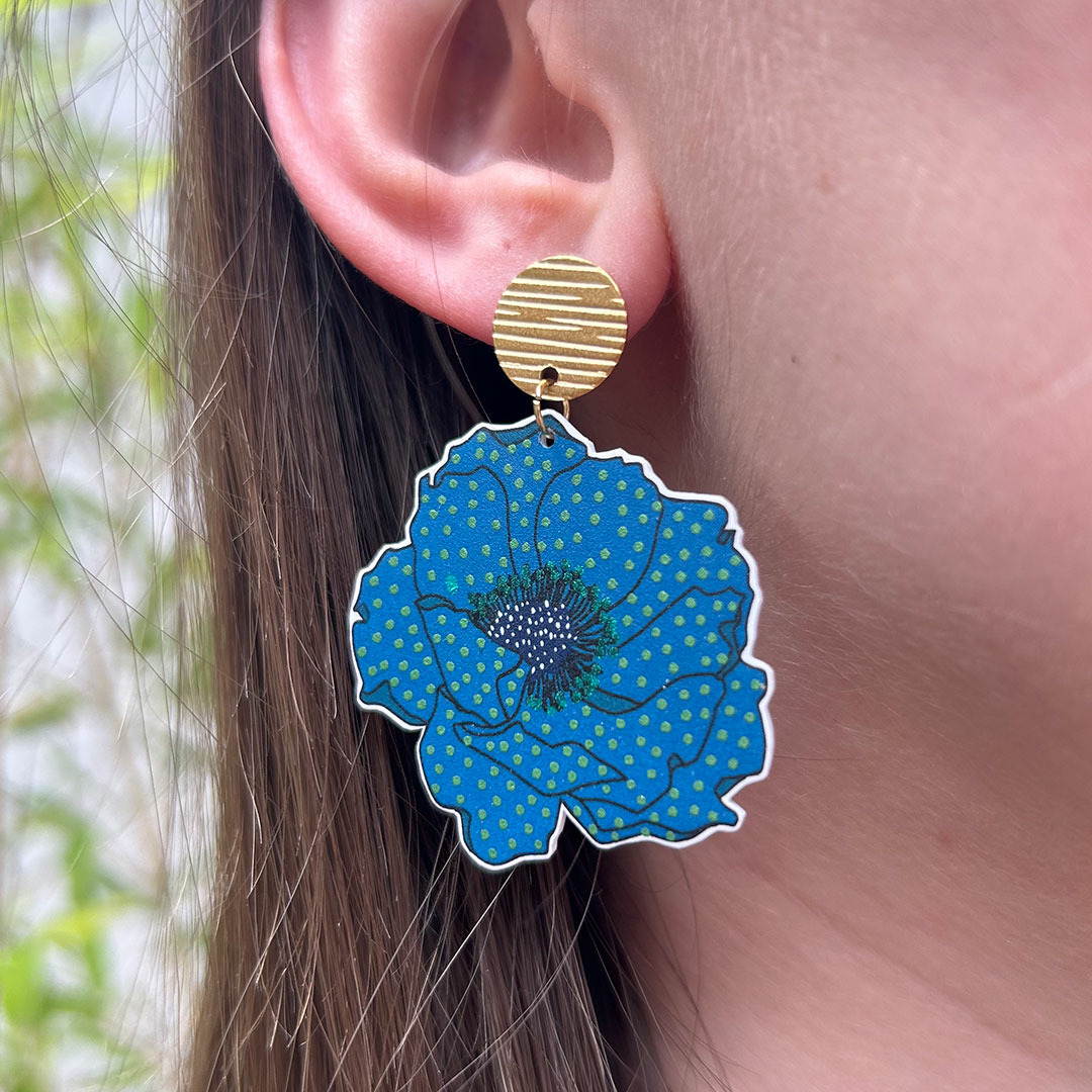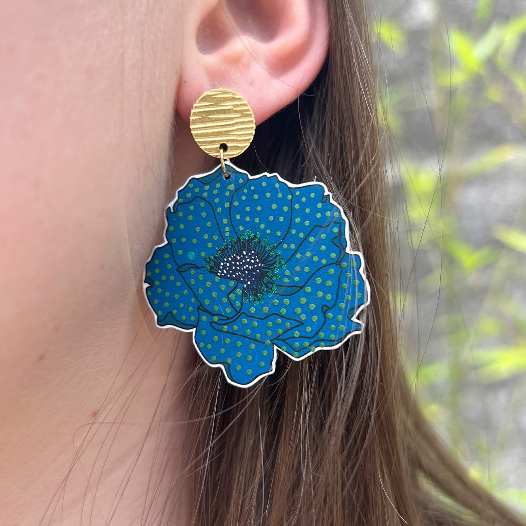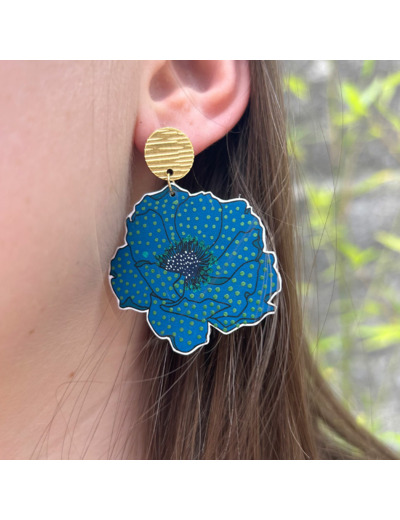 Boucles d'oreilles anémone coloris bleu pois vert pailleté