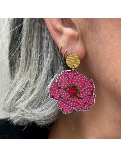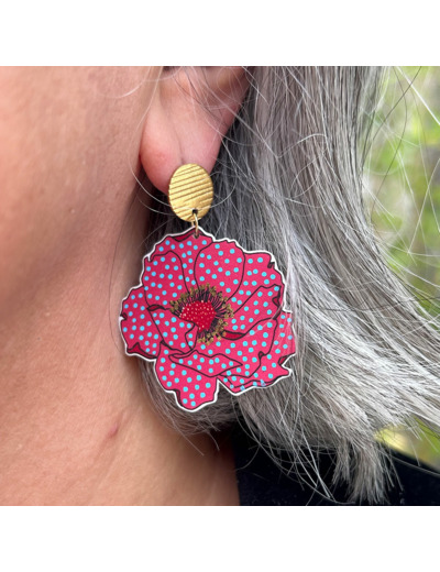 Boucles d'oreilles anémone coloris rose foncé pois bleu, pistils or