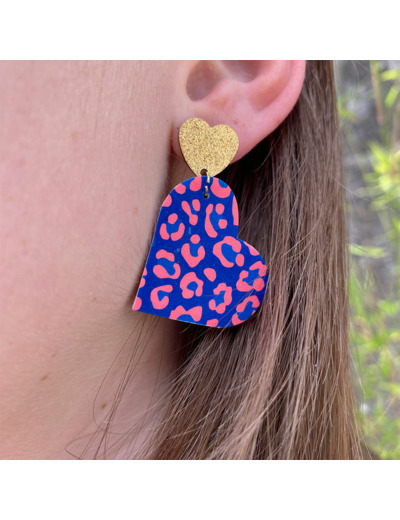 Boucles d'oreilles coeur coloris bleu motif léopard rose