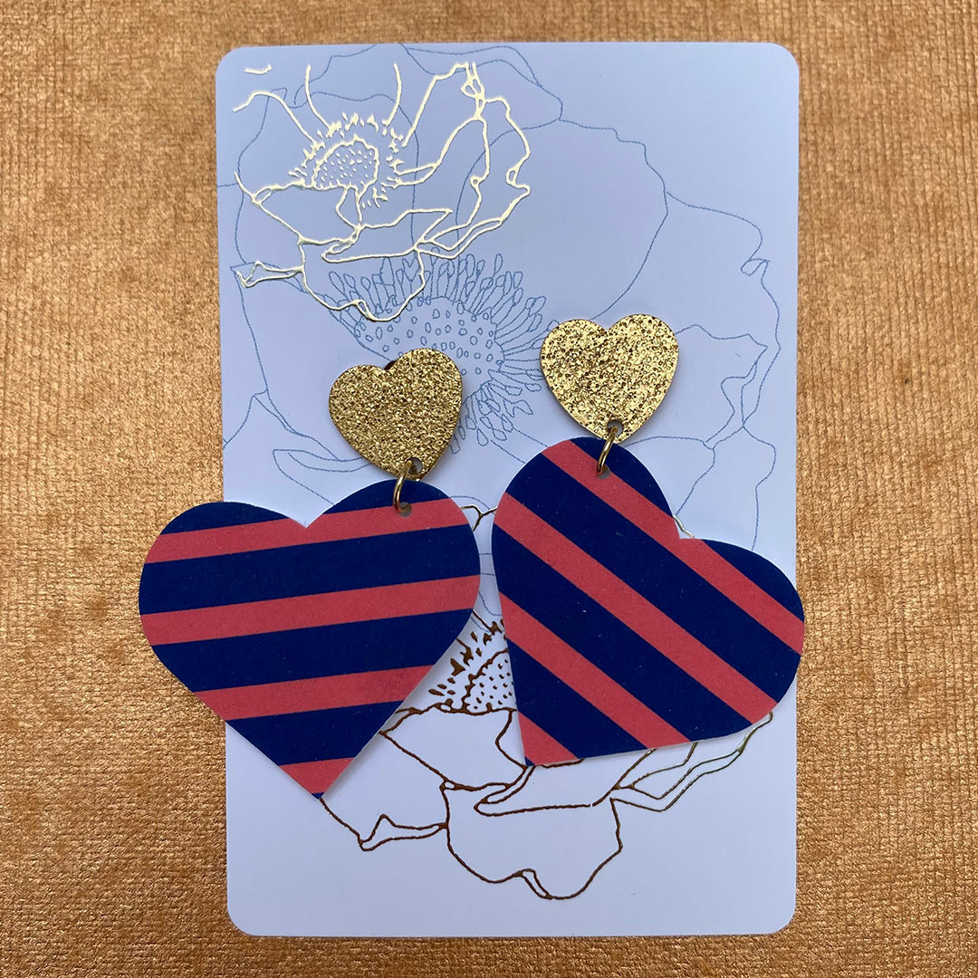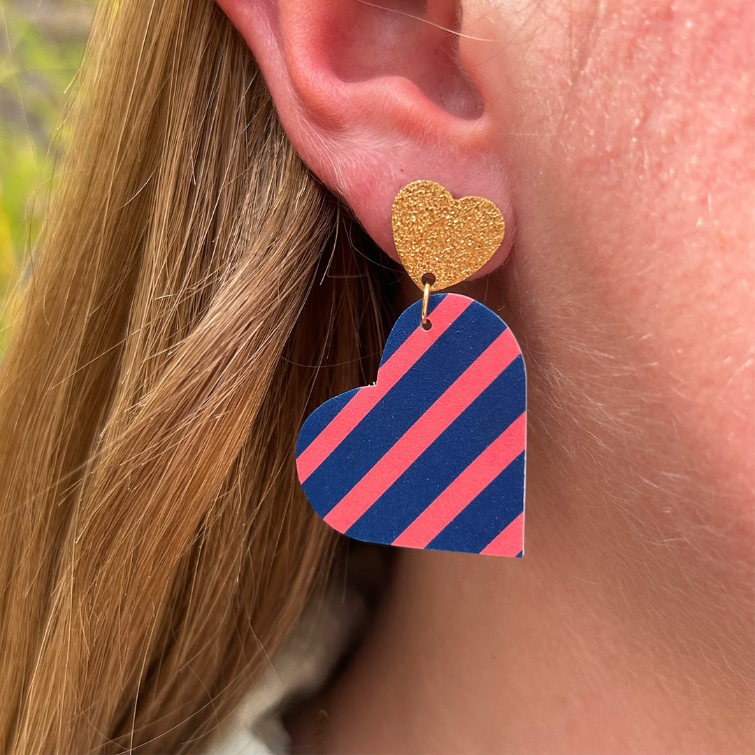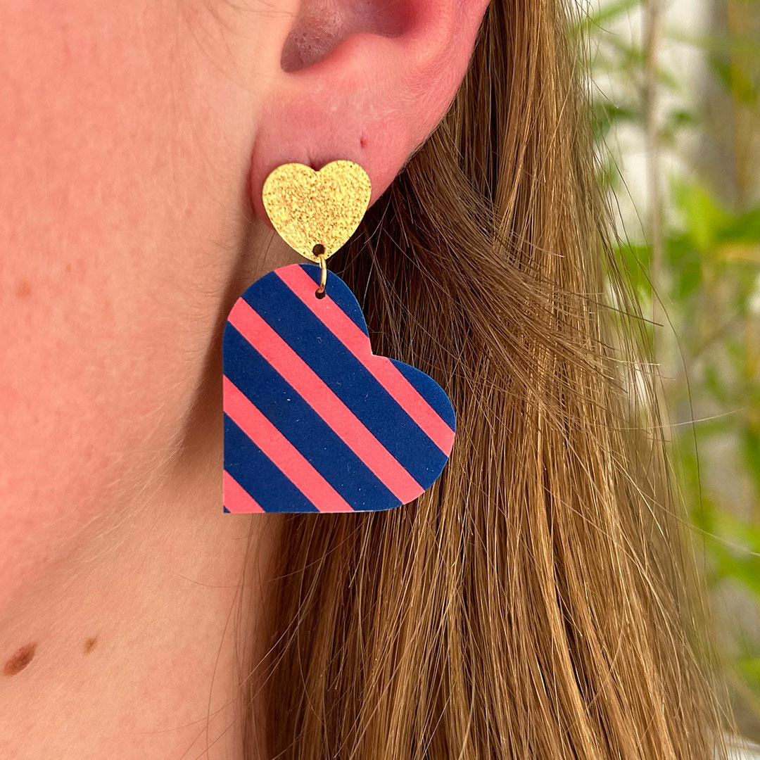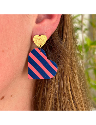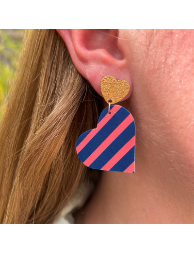 Boucles d'oreilles coeur coloris bleu rayures roses