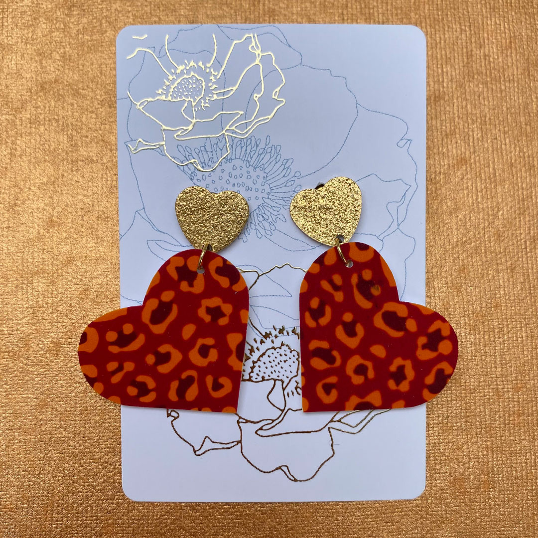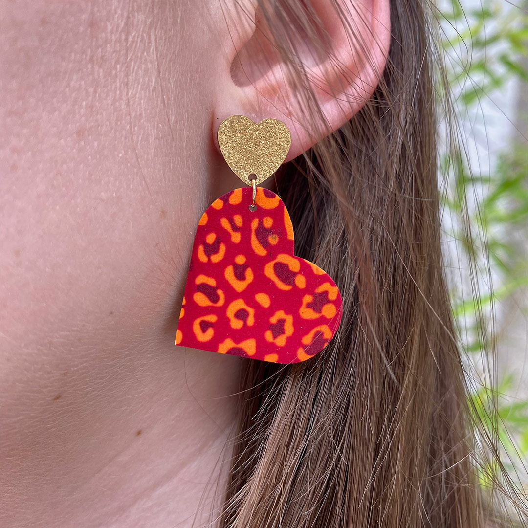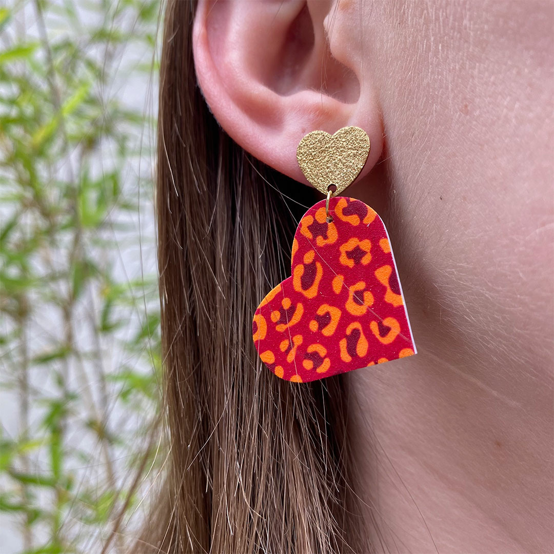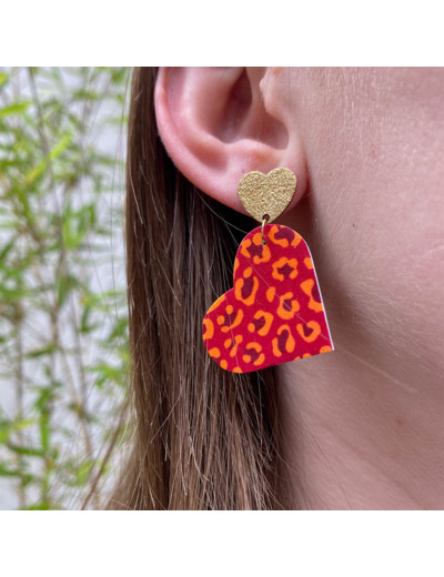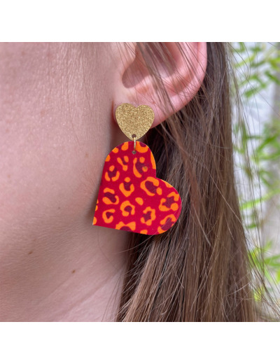 Boucles d'oreilles coeur coloris rouge motif léopard orange