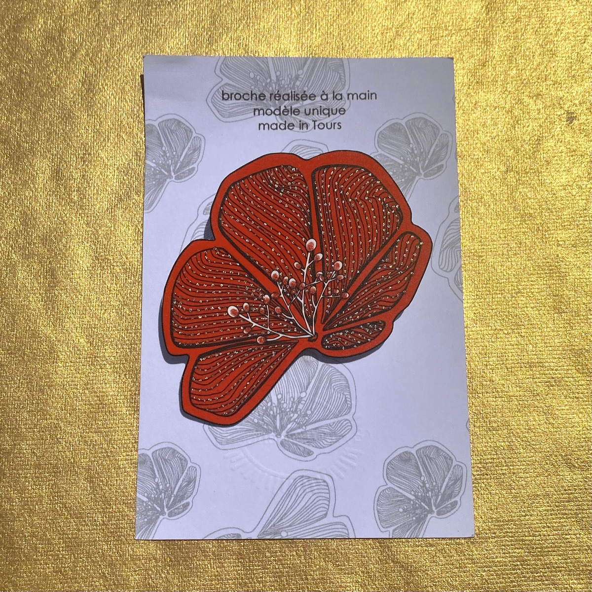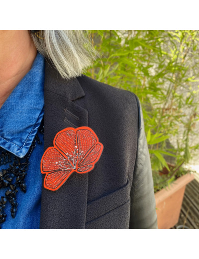 Broche demi-fleur fond orange pistils pailletés argent qui agrémentera avantageusement toutes vos tenues !