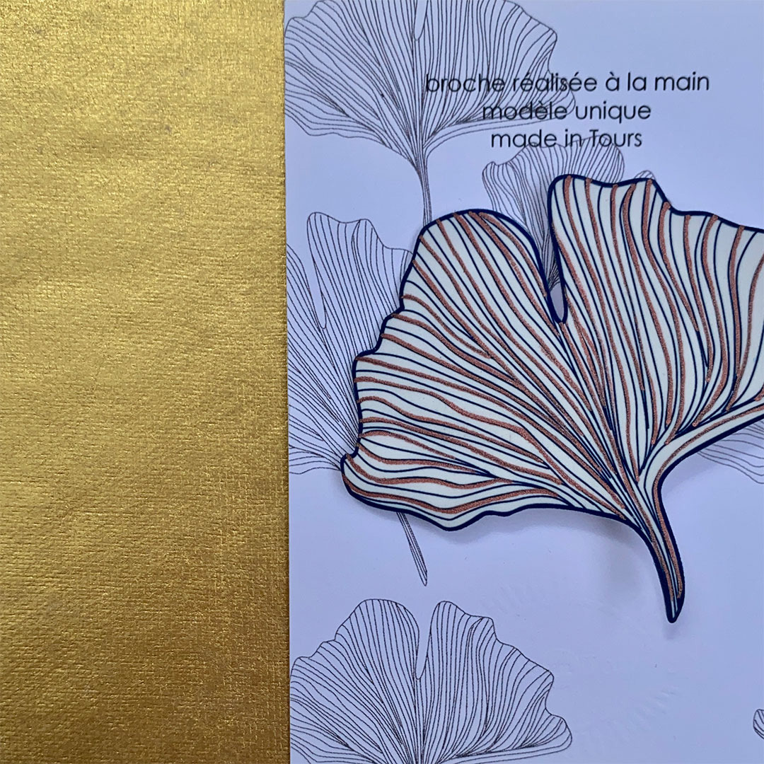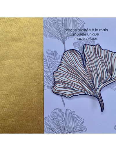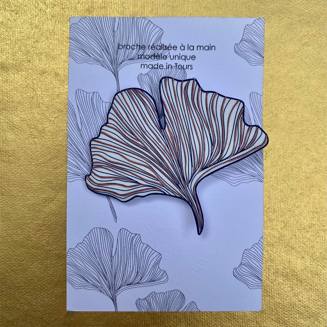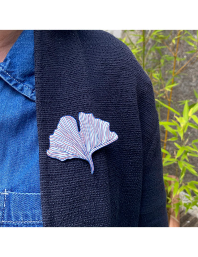 Broche ginko coloris blanc dessin bleu marine et rose irisé qui agrémentera avantageusement toutes vos tenues !