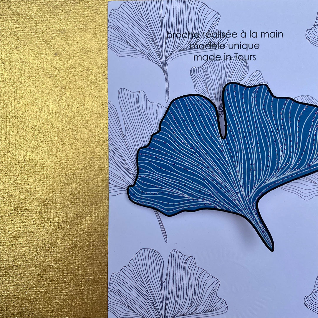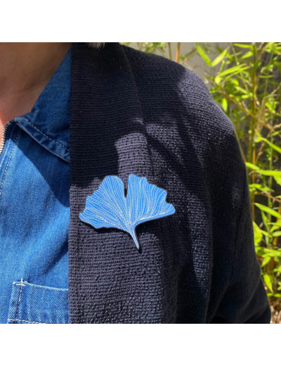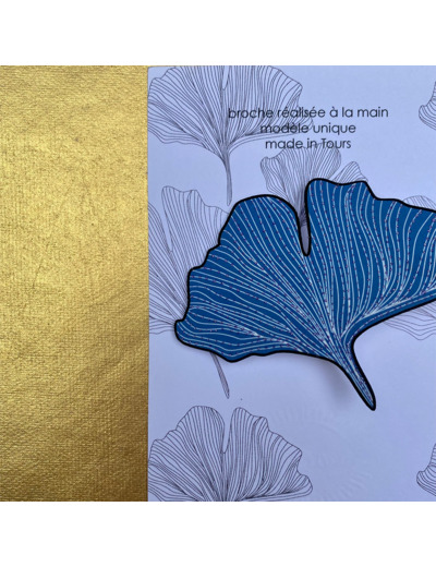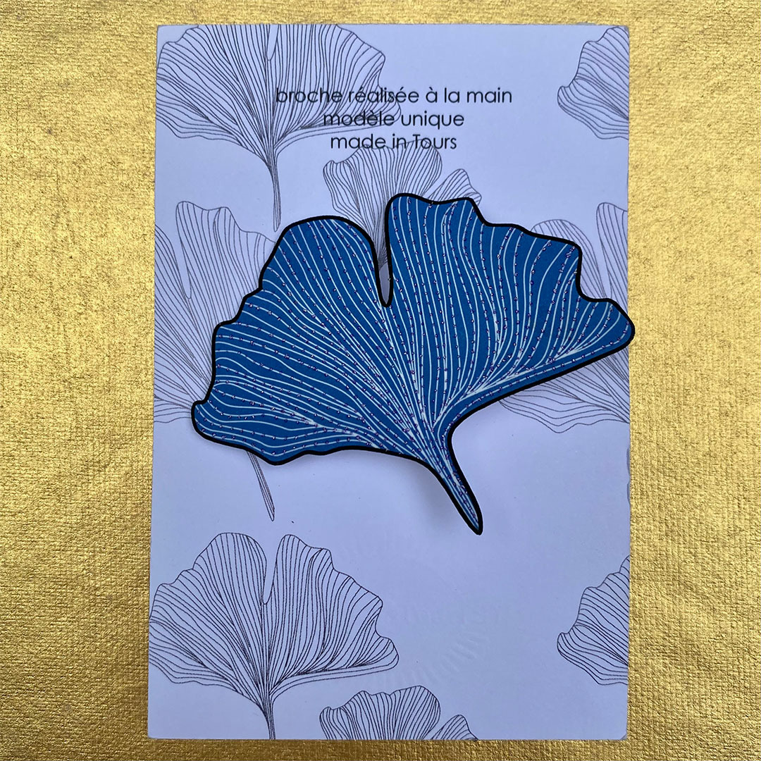 Broche ginko coloris bleu foncé pois argent qui agrémentera avantageusement toutes vos tenues !