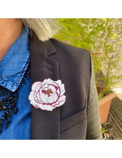 Broche pivoine fond blanc dessins rouge pistils pailletés dorés qui agrémentera avantageusement toutes vos tenues !