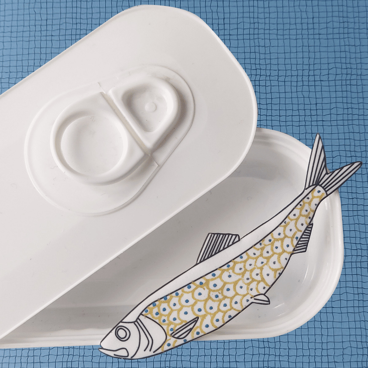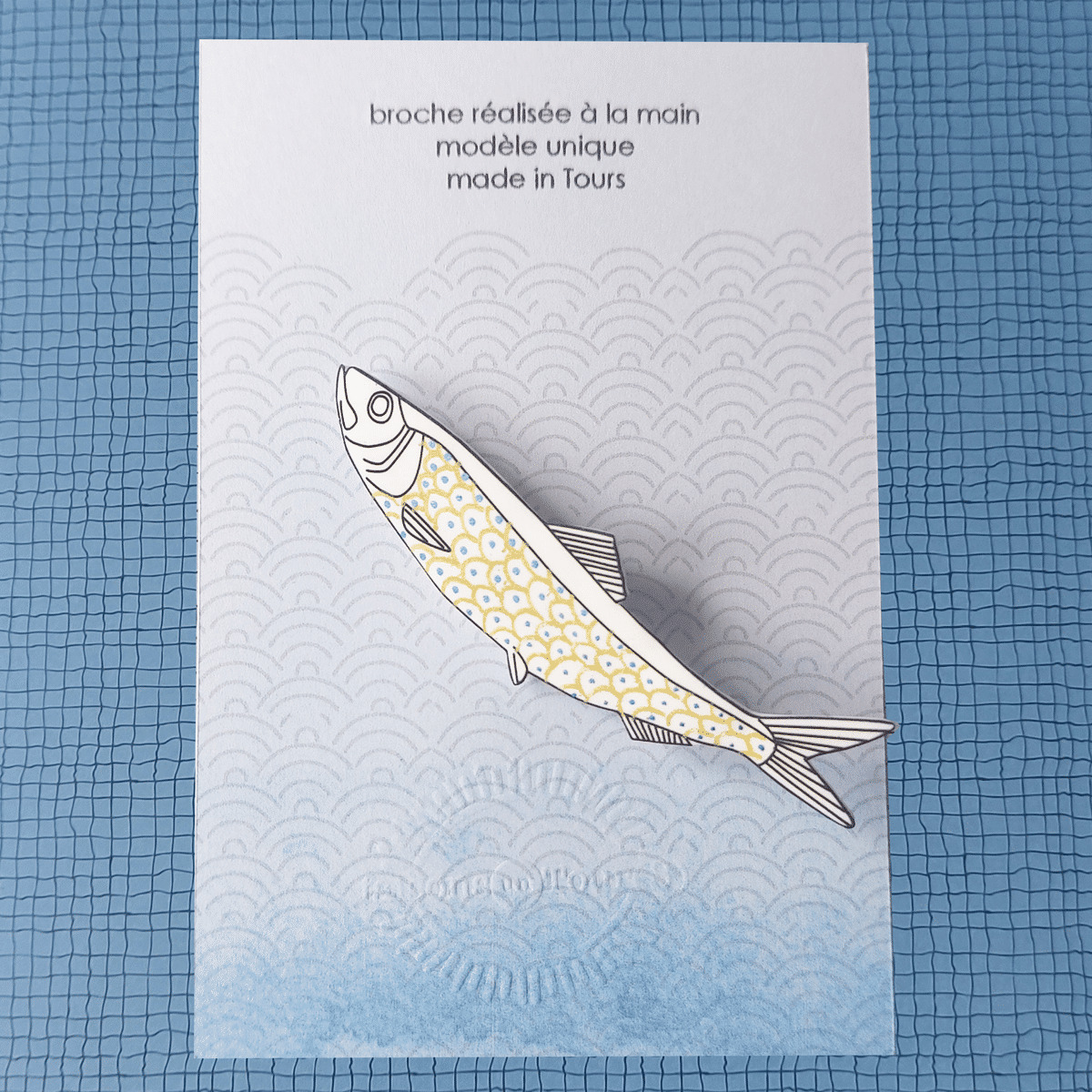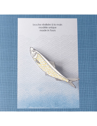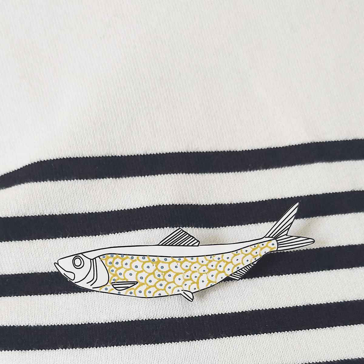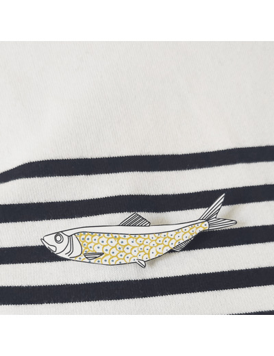 Broche sardine coloris blanc écailles dorées points bleus qui agrémentera avantageusement vos marinières pour un total look bords de mer, ou vos revers de veste !