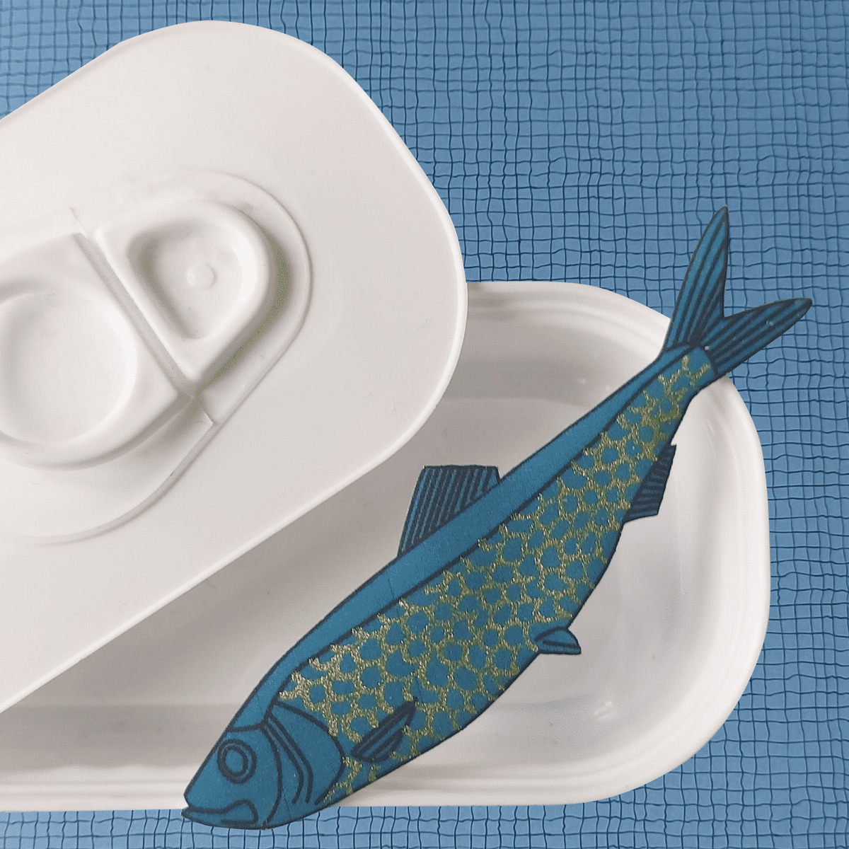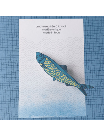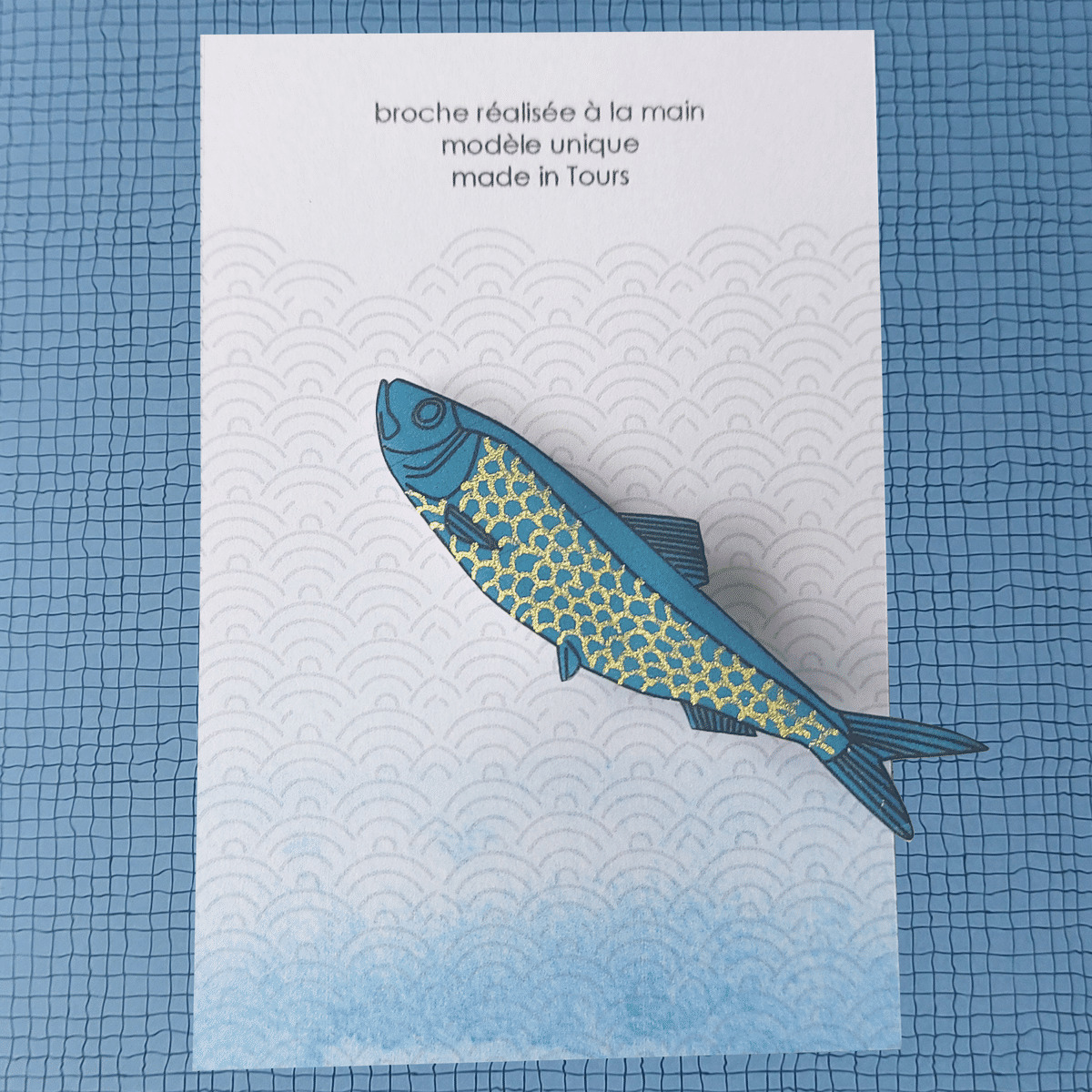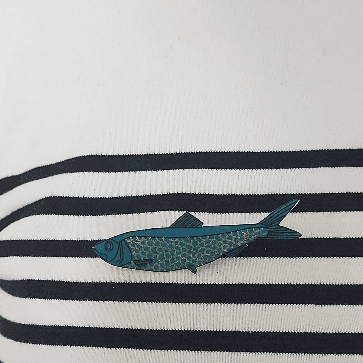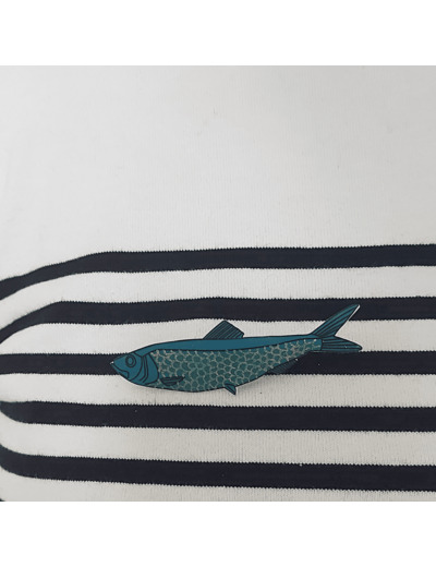 Broche sardine coloris bleu canard écailles dorées qui agrémentera avantageusement vos marinières pour un total look bords de mer, ou vos revers de veste !