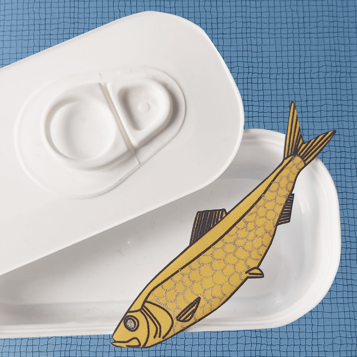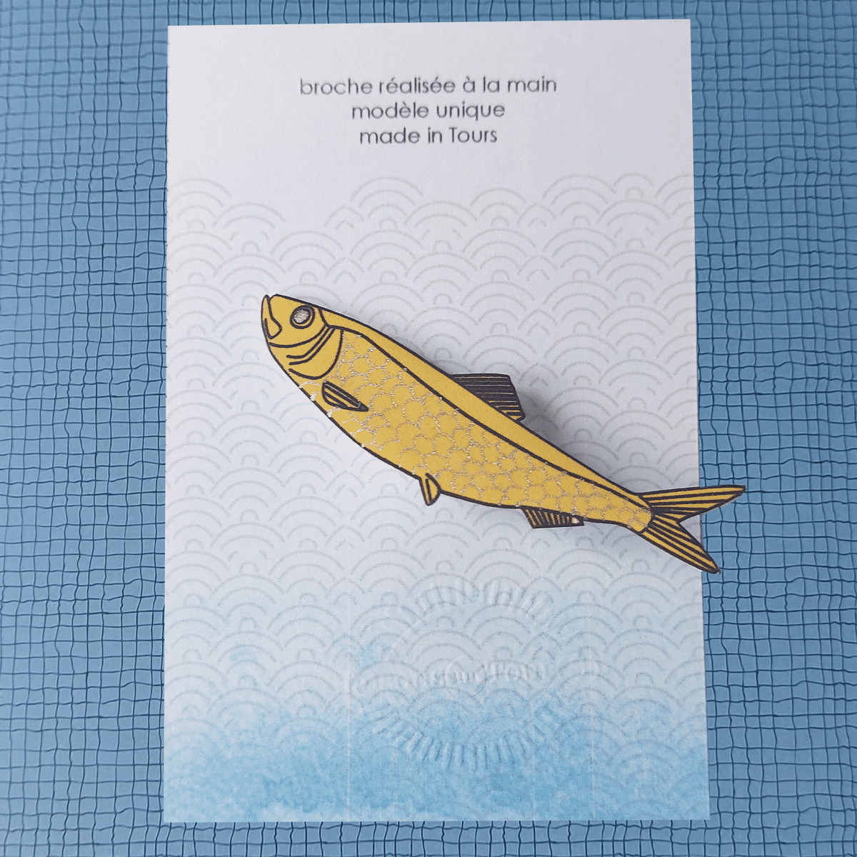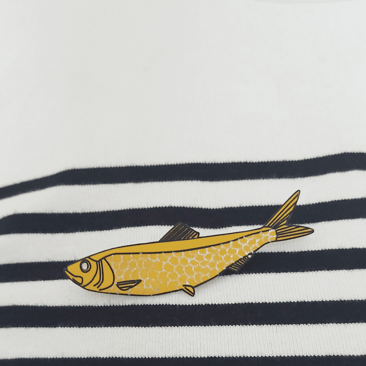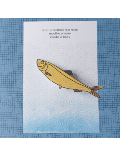 Broche sardine coloris jaune écailles argent qui agrémentera avantageusement vos marinières pour un total look bords de mer, ou vos revers de veste !
