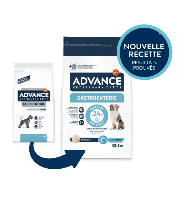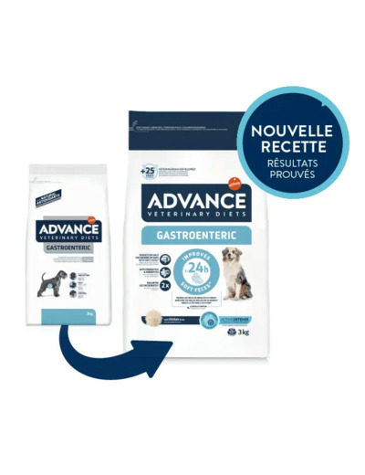 ADVANCE VETERINARY DIETS Gastroenteric est un aliment diététique complet pour chiots et chiens adultes, à base d'ingrédients hautement digestibles, à faible teneur en matières grasses et avec une concentration plus élevée en sodium et en potassium, pour aider à réduire certaines affections gastro-intestinales et en cas d'insuffisance pancréatique exocrine.