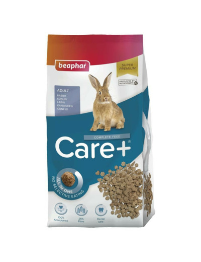 Conseils d'utilisation : L’alimentation CARE+® est très appétente et immédiatement acceptée par l’animal. Cependant, dans un premier temps, il est recommandé de surveiller sa consommation et, si nécessaire, de mélanger CARE+® à l'aliment précédent. La quantité journalière de granulés à donner dépend de la taille et du poids du lapin. Donner une quantité de 40 à 60 g par jour à un lapin de 2,5 kg. Ces quantités doivent être divisées de préférence en deux repas.
