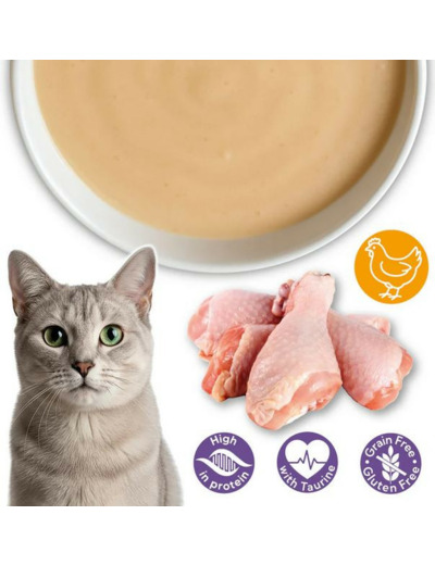 Crème de poulet pour chats, élaborée avec des ingrédients naturels de haute qualité.