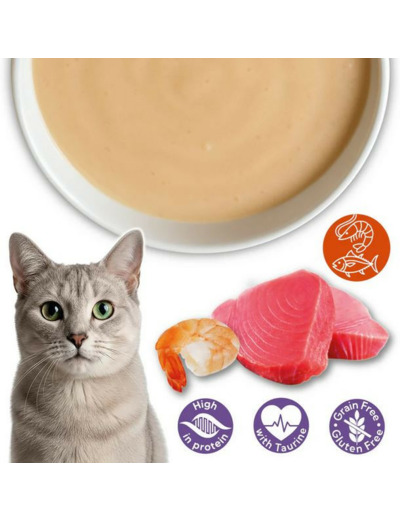 Crème de thon et de crevettes pour chats, élaborée à partir d'ingrédients naturels de haute qualité.
