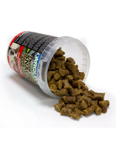 COMPOSITION : viande de poulet, céréales, veau déshydraté, pulpe de betterave, petits pois et glycérine.