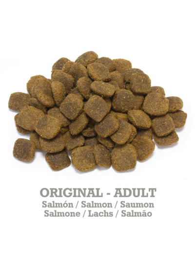 Croquettes Premium pour chiens adultes de toutes races, à base de saumon, de riz et d'ingrédients naturels de haute qualité.
