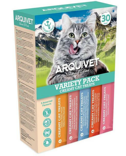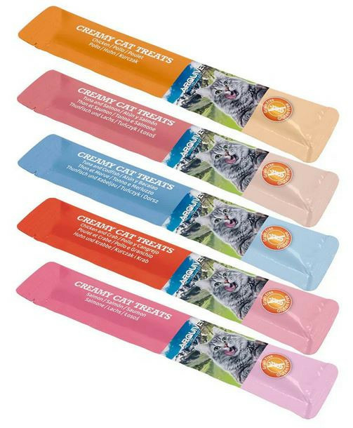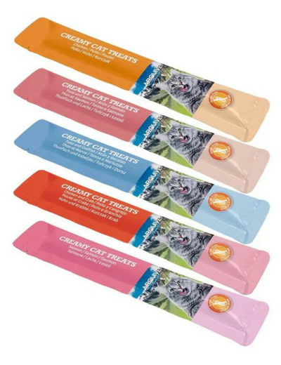 Lot de 5 saveurs de friandises crémeuses pour chats. Poulet, thon et saumon, thon et cabillaud, poulet et crabe, saumon. Facilement absorbées, elles favorisent une digestion saine. Sans céréales, sans gluten. Sans colorants, conservateurs ni sucres ajoutés. Une délicieuse friandise que nos chats lècheront avec plaisir.