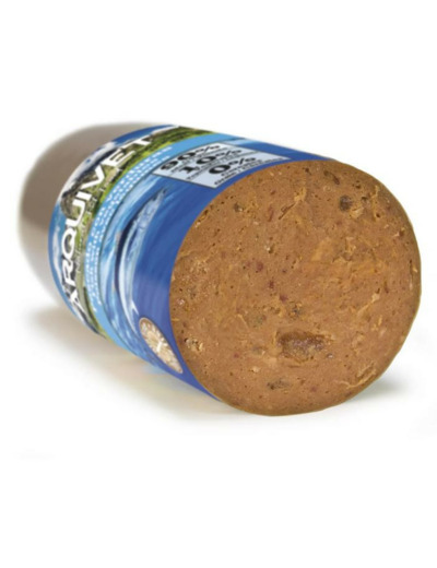 Saucisse de poisson aux légumes. Un aliment complet et savoureux pour tous les types de chiens, favorisant un métabolisme sain. 90 % viande, 10 % légumes.