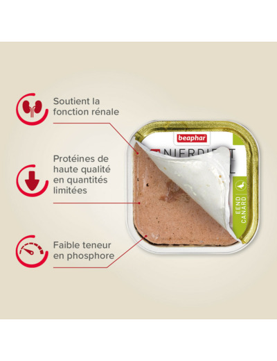 Conseils d'utilisation : Durée d’utilisation recommandée : Initialement jusqu’à 6 mois. Il est recommandé de consulter un vétérinaire avant l’utilisation ou avant de prolonger la durée d’utilisation. En cas d’utilisation pour une insuffisance rénale temporaire, la durée d’utilisation recommandée est de 2 à 4 semaines. Ne donnez pas d’autres aliments ou friandises en plus de ce régime, sauf en cas de prescription contraire. Recommandation : Divisez la quantité quotidienne en plusieurs portions. L’eau doit toujours être disponible et doit être rafraîchie chaque jour. Après ouverture de la barquette, conservez-la dans un endroit frais, utilisez-la dans les 48 heures, servez-la à température ambiante.