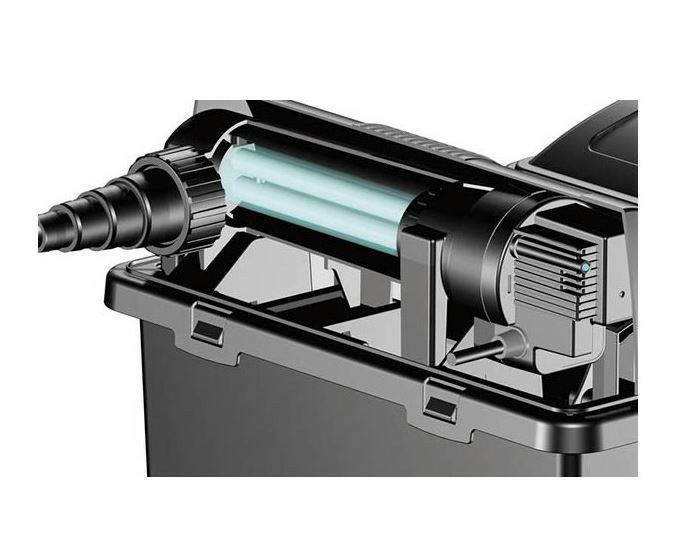 Le système UV intégré aura pour utilité de détruire les micro-algues responsables de l'eau verte afin de profiter pleinement des poissons et de limiter la propagation des bactéries et virus pathogènes dans le bassin.