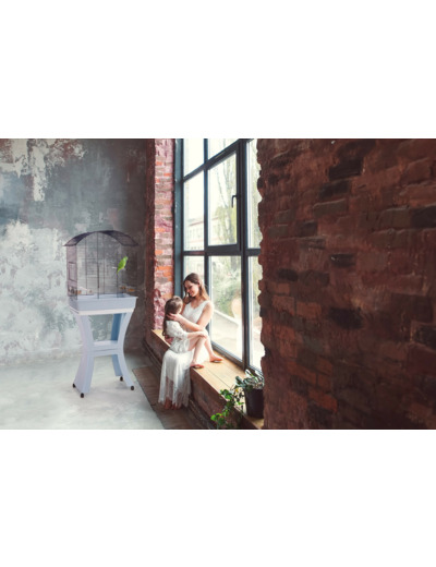 Calla, une belle cage pour perruches et calopsittes, avec une grande base rectangulaire, dotée d'un support de cage en plastique robuste, assorti à la couleur du fond et équipée de roues pivotantes pour la déplacer confortablement d'un endroit à un autre.